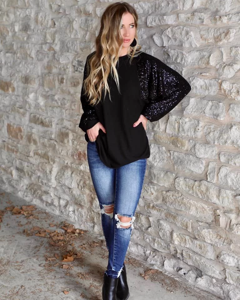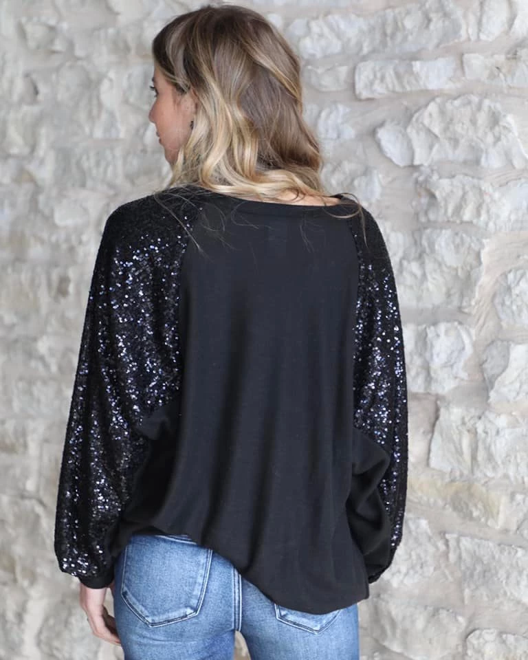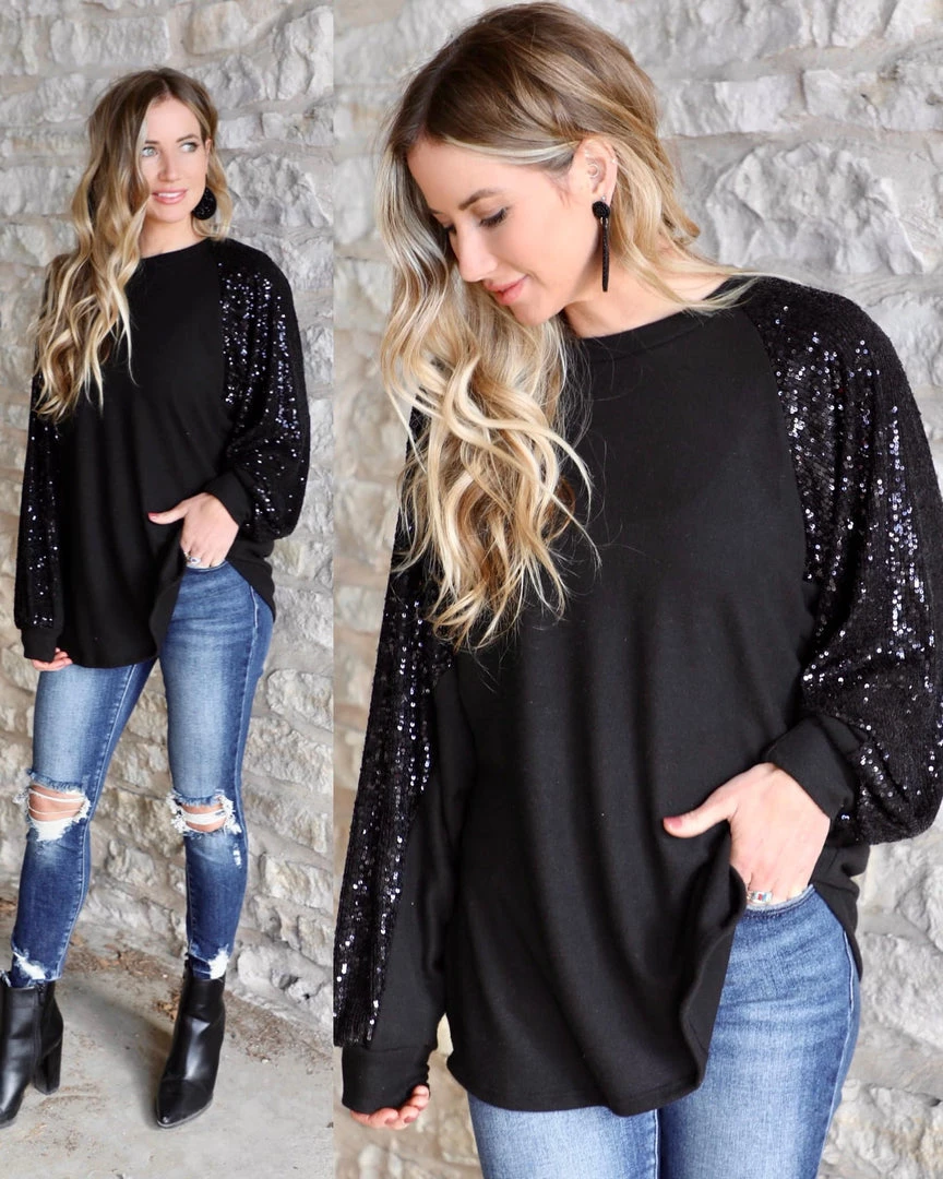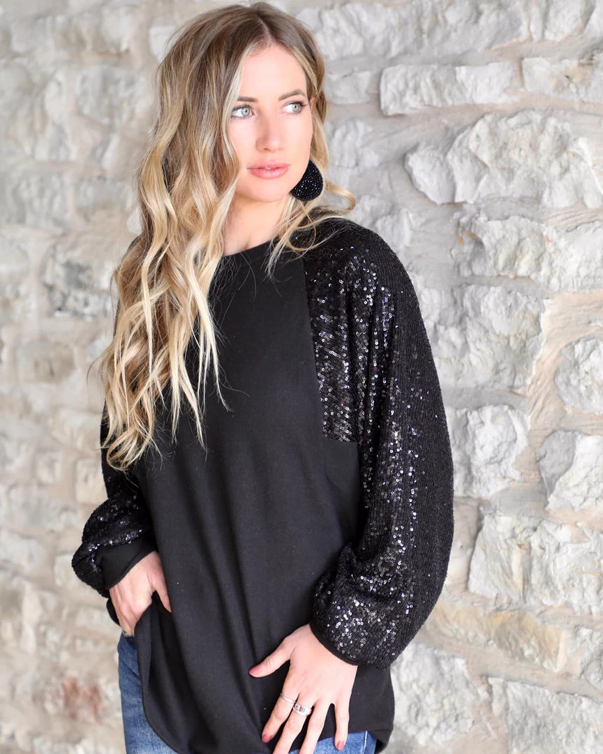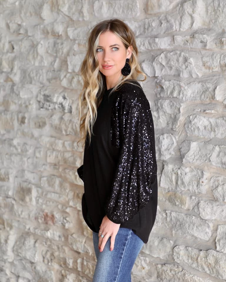 Black sequin bishop sleeve long sleeve top. Haley is size 1 and 5’5” wearing the small. Relaxed fit. You can size down if you prefer a smaller fit.