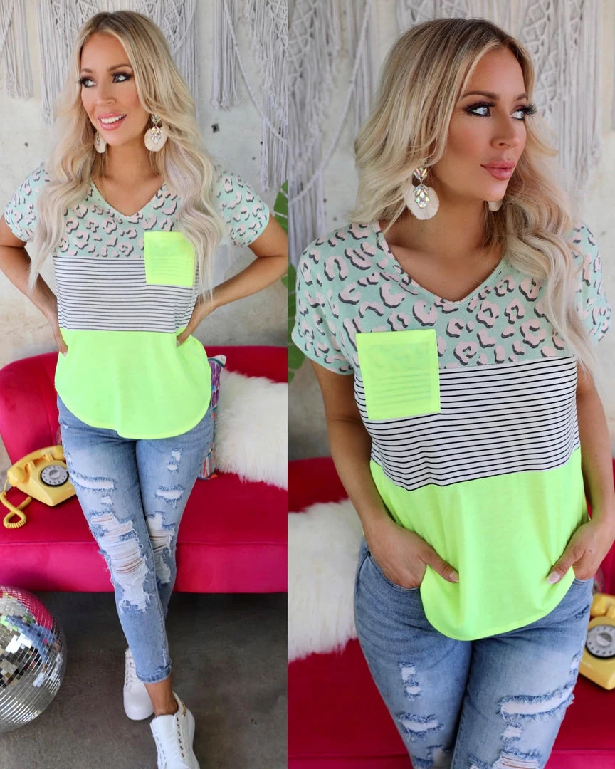 A COLOR BLOCK KNIT TOP FEATURING A ANIMAL PRINT, PIN STRIPE, FRONT POCKET, V NECK, RELAXED FIT, AND SHORT SLEEVES.