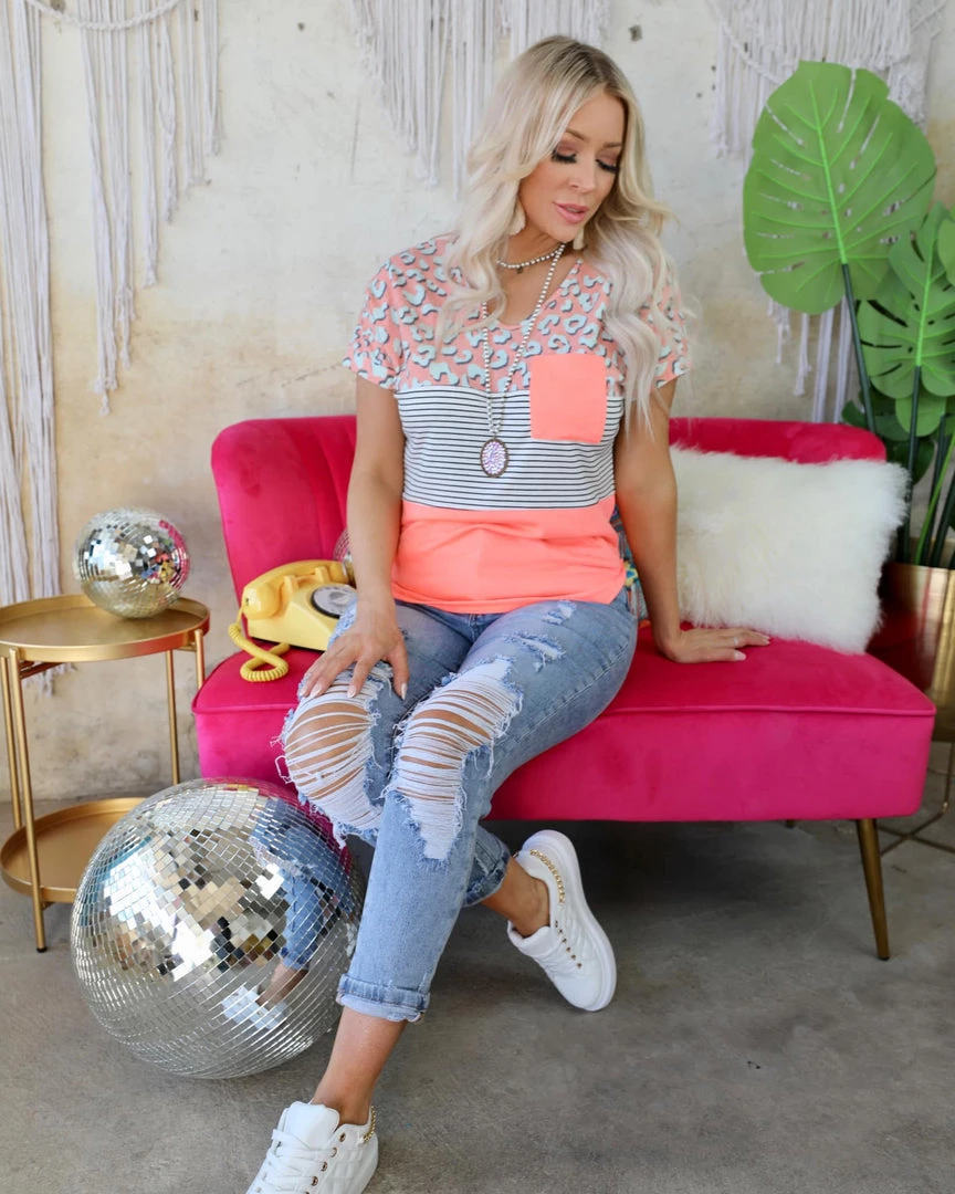 A COLOR BLOCK KNIT TOP FEATURING A ANIMAL PRINT, PIN STRIPE, FRONT POCKET, V NECK, RELAXED FIT, AND SHORT SLEEVES.