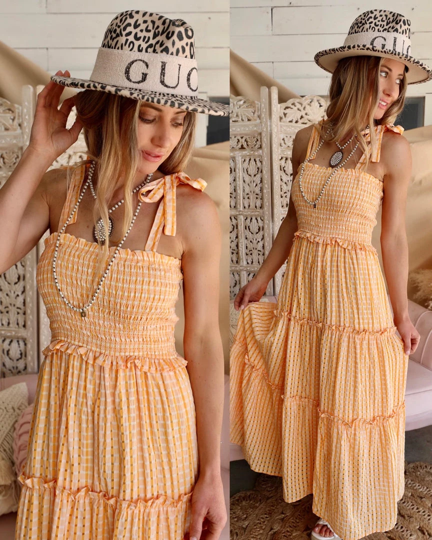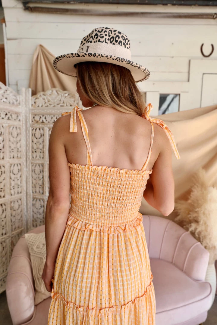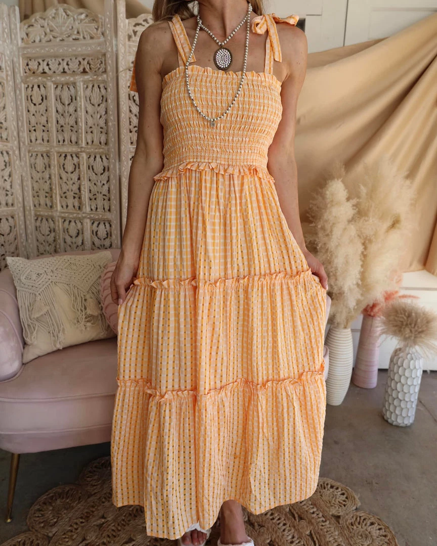 Odette Orange Plaid Smocked Tie Strap Ruffle Dress