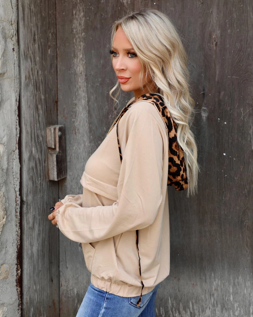 Half zipper front taupe hoodie with leopard hood details and drawstrings