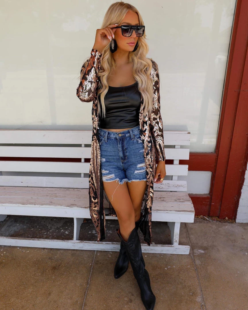 SKU: beston-7256442306737 Categories: Apparel, Cardigans + Kimonos, New, Outerwear, TOPS Tags: Apparel, Black, Duster, June22, Mesh, New, Sequin, Top