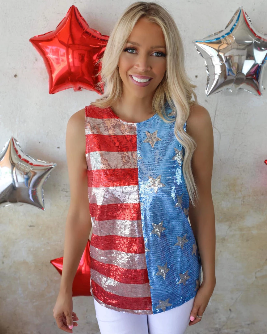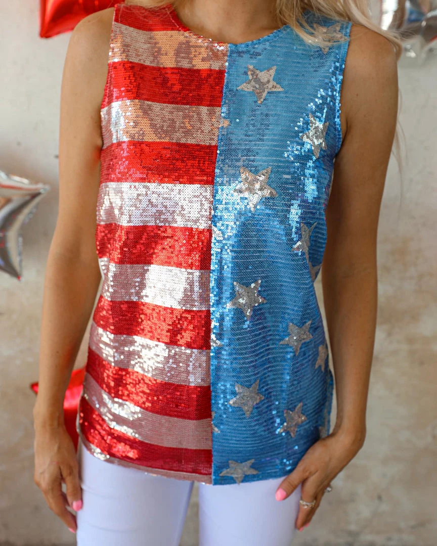 SKU: bibi-7233263894705 Categories: Americana, Apparel, Tank Tops + Halters, TOPS, Tops, Trends Tags: America, Americana, Apparel, Extra large, May22, Sequin, Tank top, Top