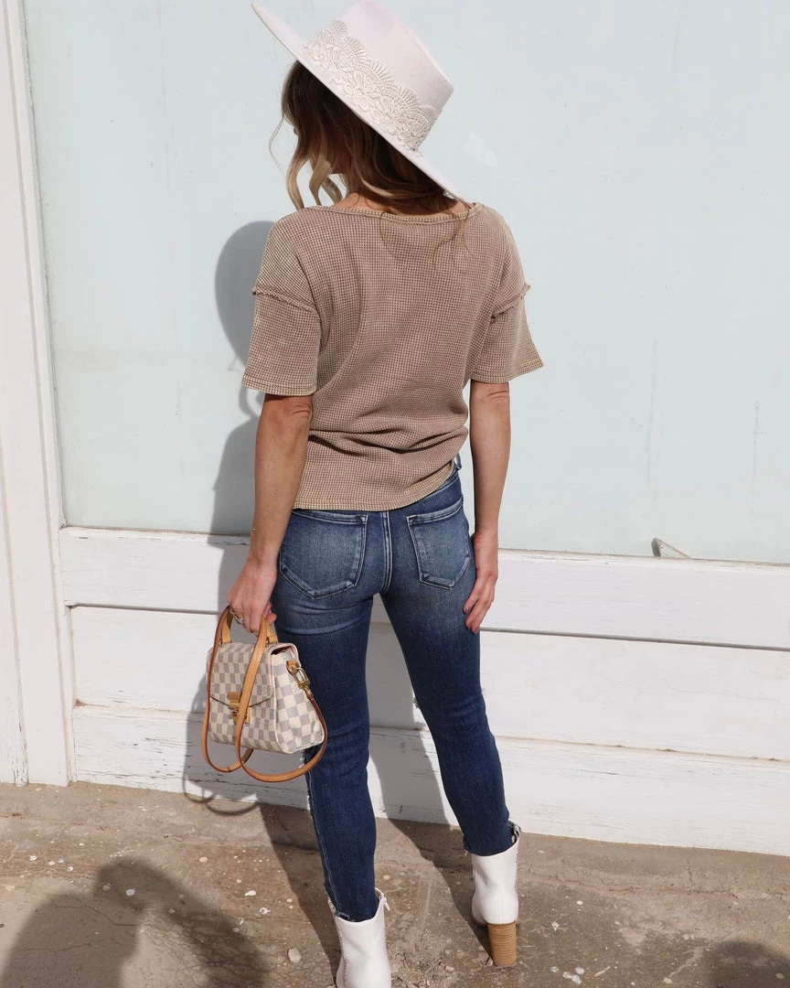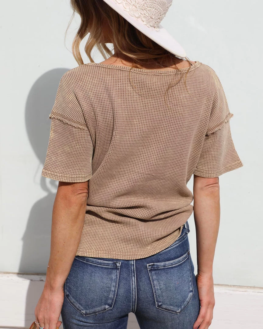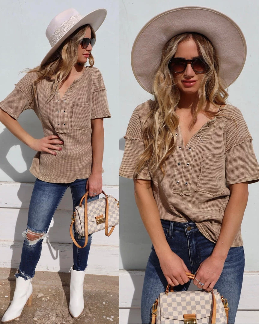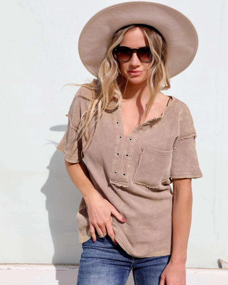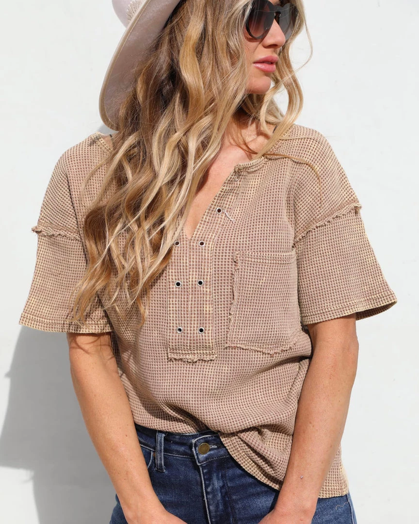 WASHED THERMAL TOP WITH EYELET PLACKET AND FRONT PATCH POCKET