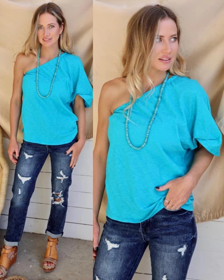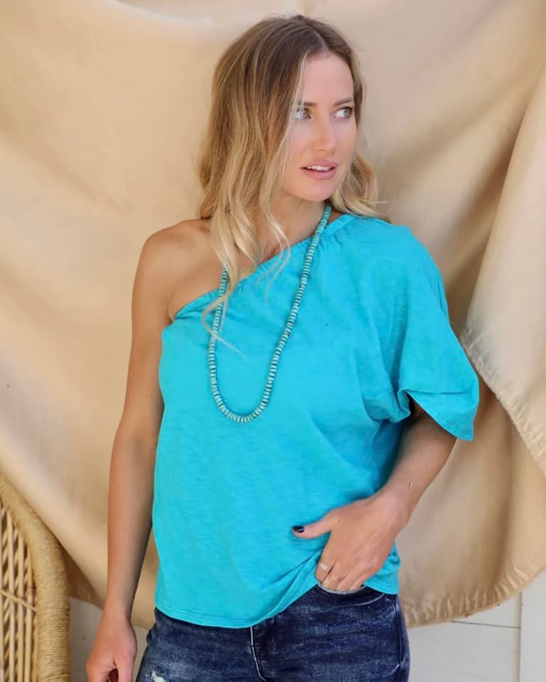 One shoulder off white cotton jersey knit top. Can be worn ON or OFF the shoulder as shown.