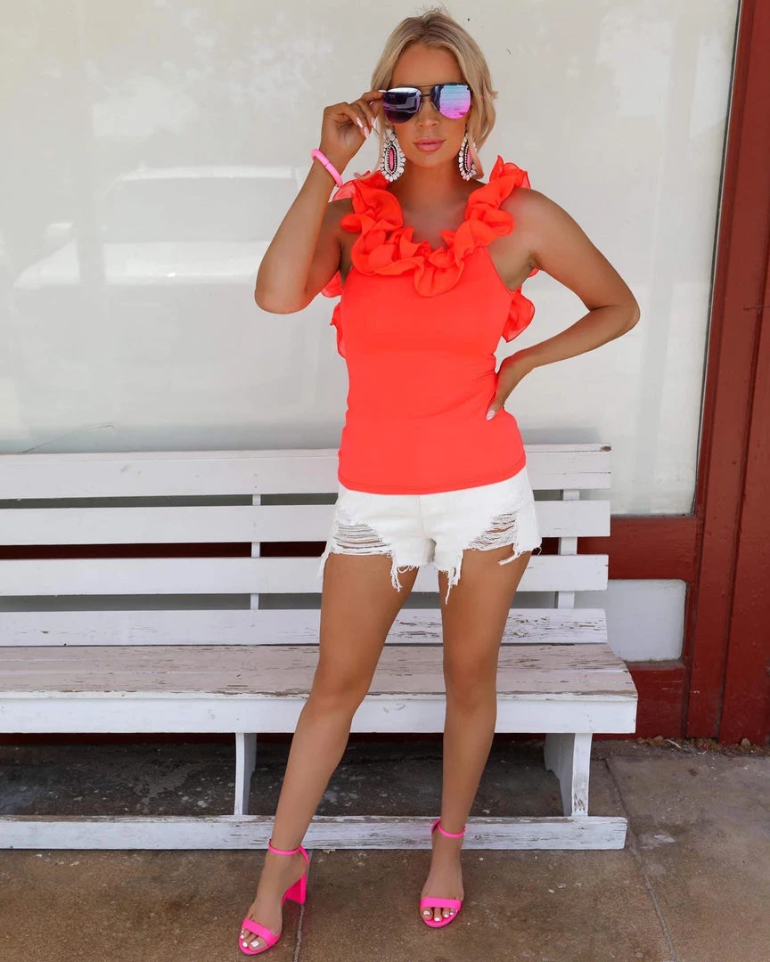 SKU: bibi-7254162735281 Categories: Apparel, Neon Summer, New, Tank Tops + Halters, TOPS, Tops, Trends Tags: Apparel, Coral, June22, Neon, New, Ruffle, Tank, Tank top