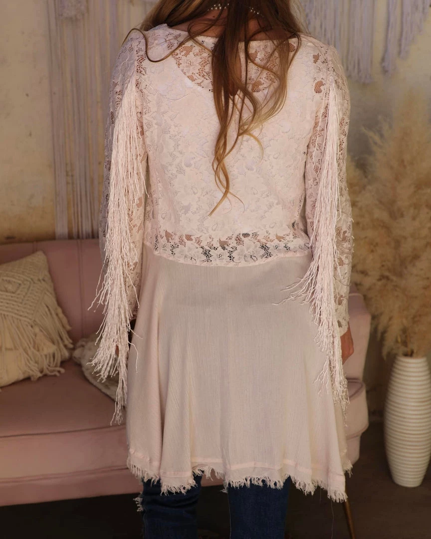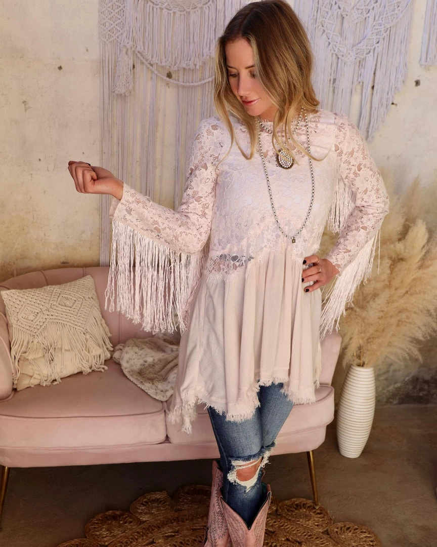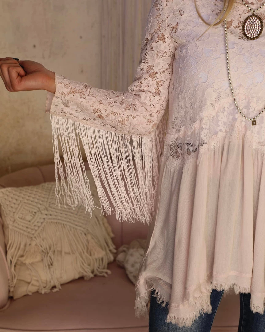 Boho Lace Contrast Mix Fringe Sleeve Tunic