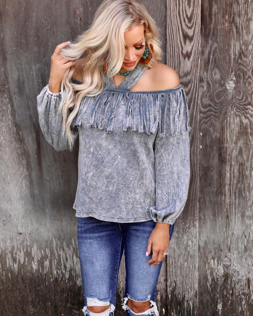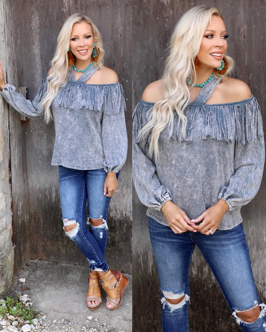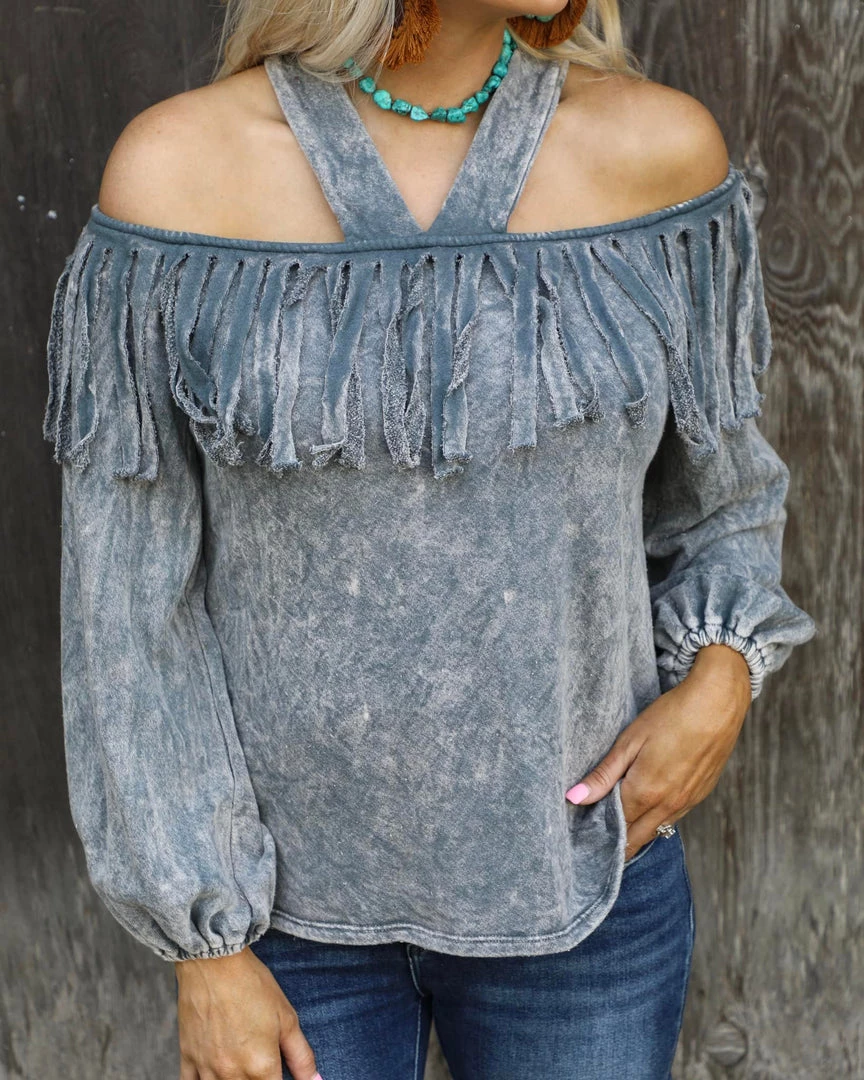 Mineral dyed cold shoulder fringe top