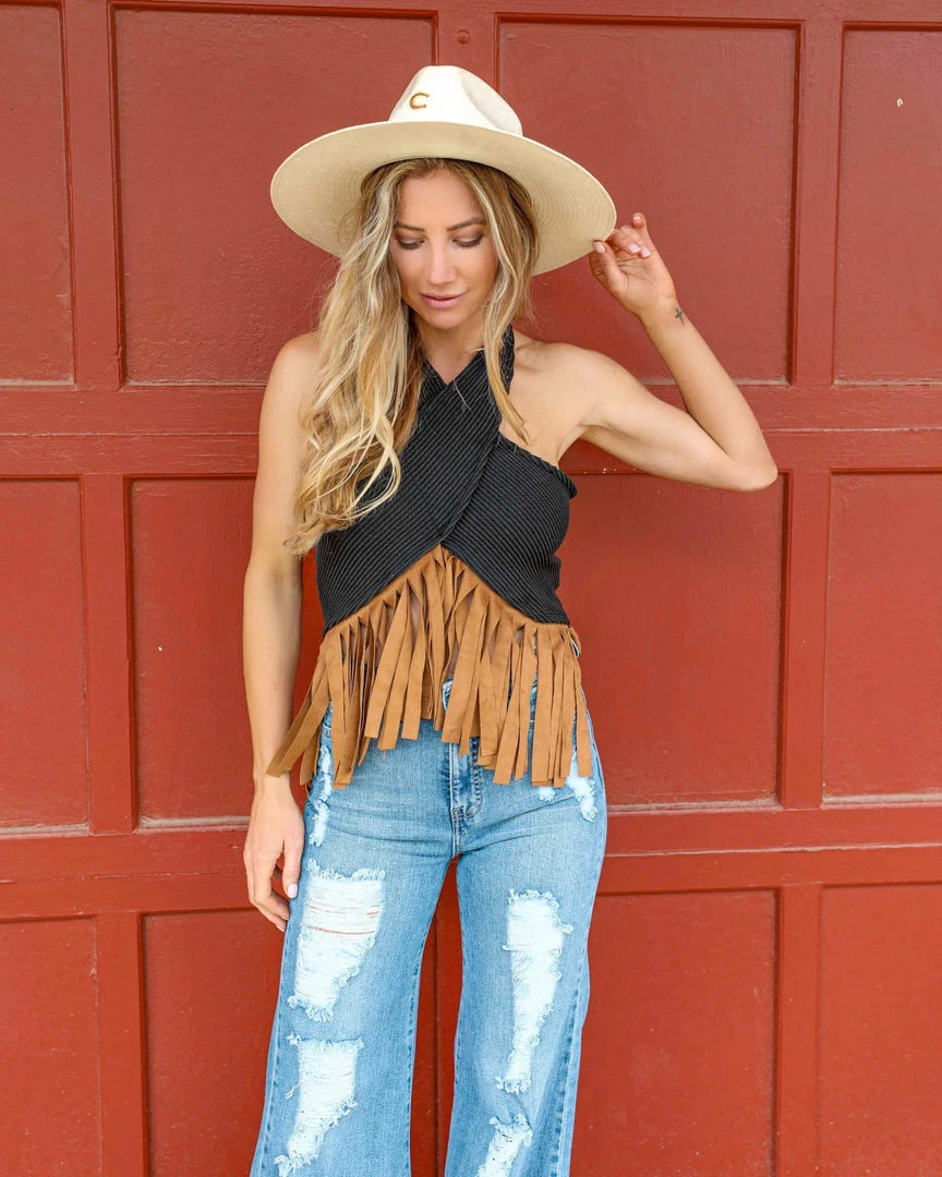 Be the first to review “Blue Buttercup Black Ribbed Halter Top With Faux Suede Fringe” Cancel reply