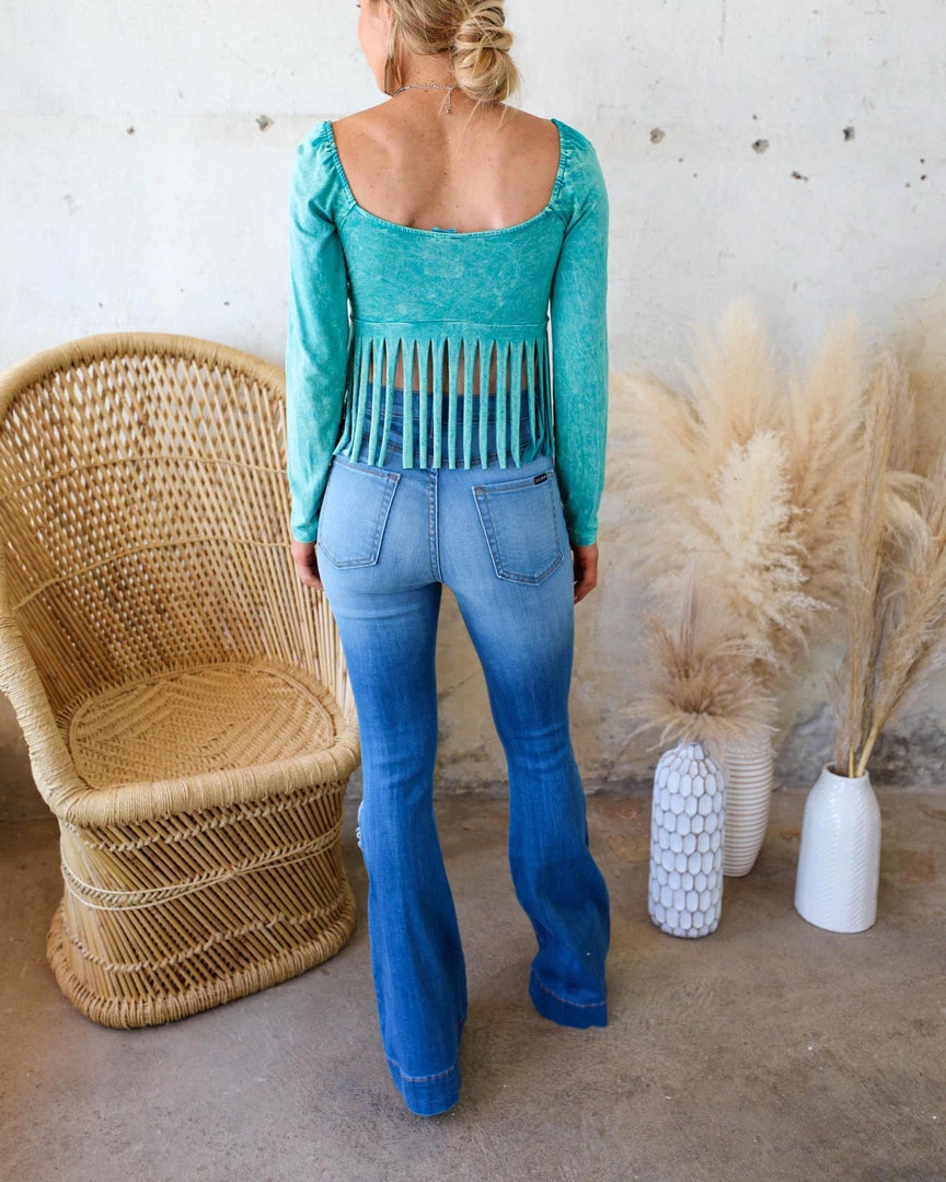 Be the first to review “Blue Buttercup Turquoise Mineral Dyed Fringe Crop Top” Cancel reply