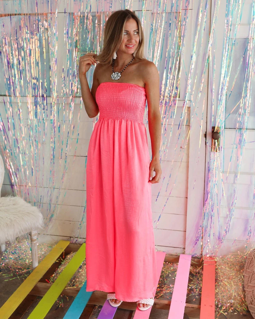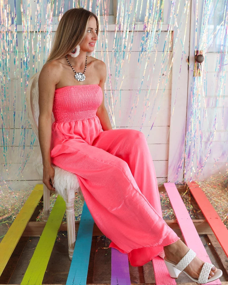 SKU: bucket-list-7254058467505 Categories: Apparel, DRESSES, Neon Summer, New, Rompers + Jumpers, Trends Tags: Apparel, Flared leg, Jumpsuit, June22, Neon pink, New, Tube top