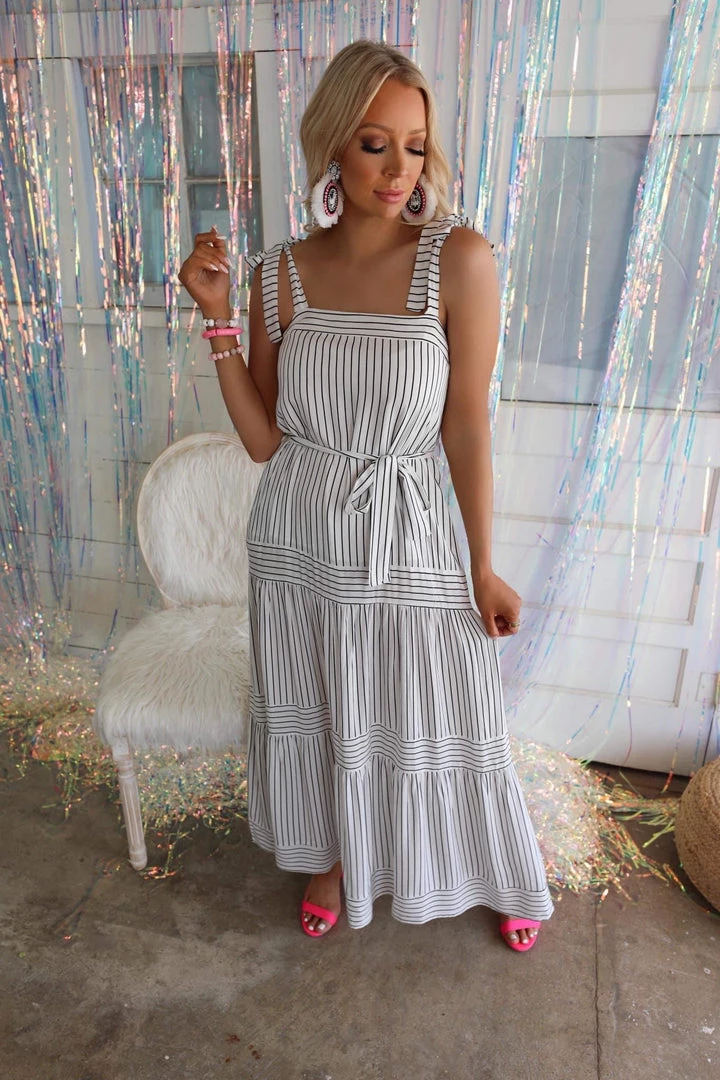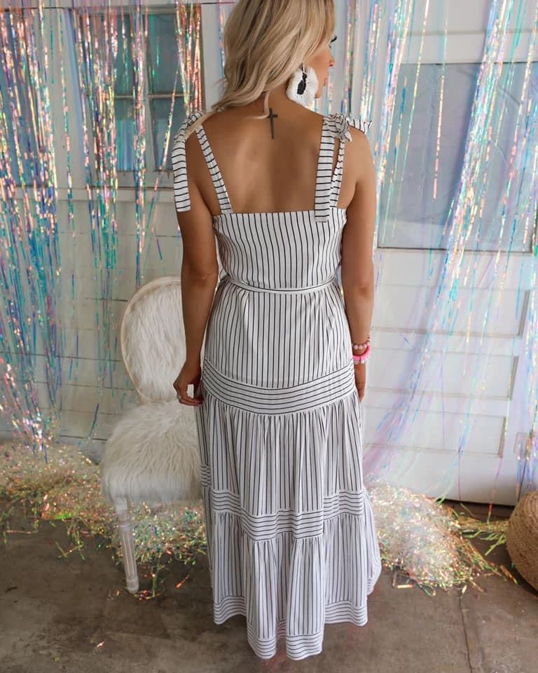 SKU: cezele-7254174597297 Categories: All Dresses, Apparel, Casual + Basic, DRESSES, New Tags: Apparel, Black, Casual, Dress, June22, Maxi, Striped, White