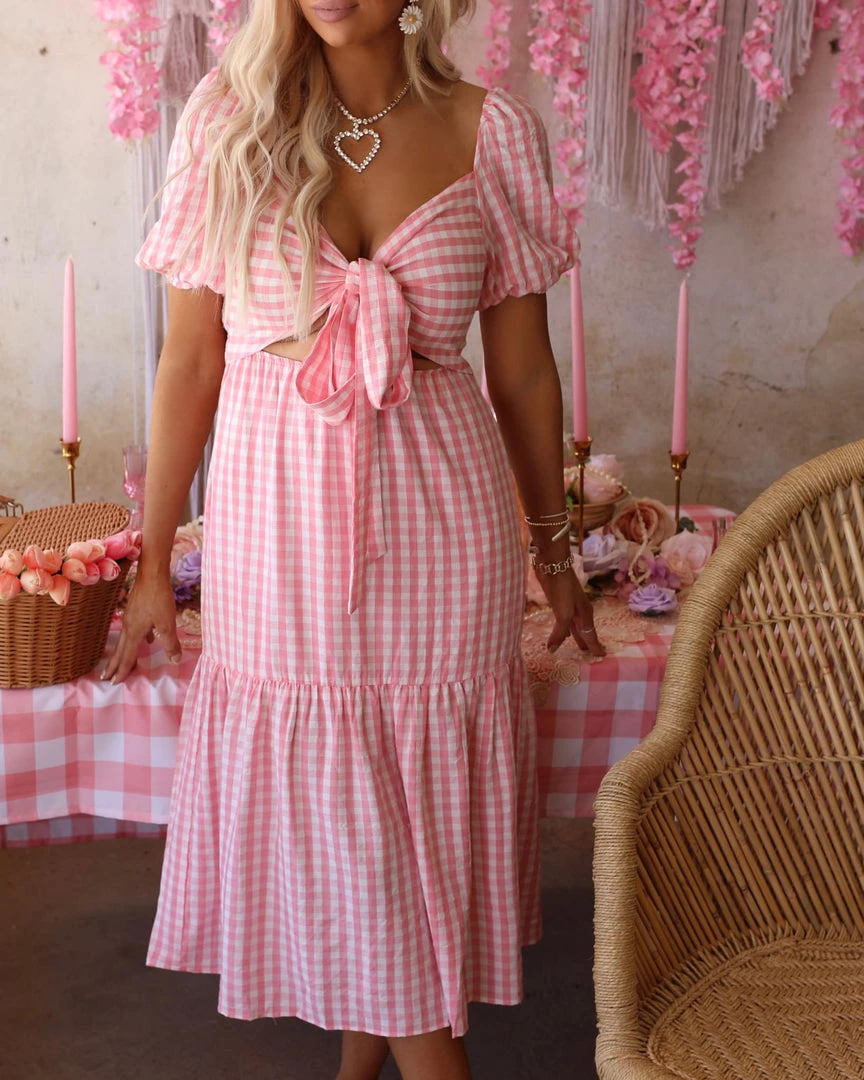 Be the first to review “Cherry Cloth Picnic Time Pink Checkered Tie Front Dress Apparel” Cancel reply