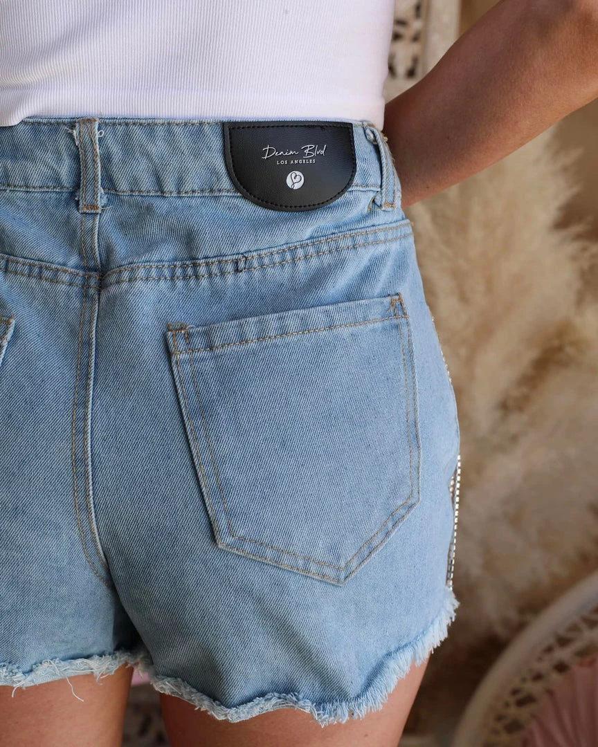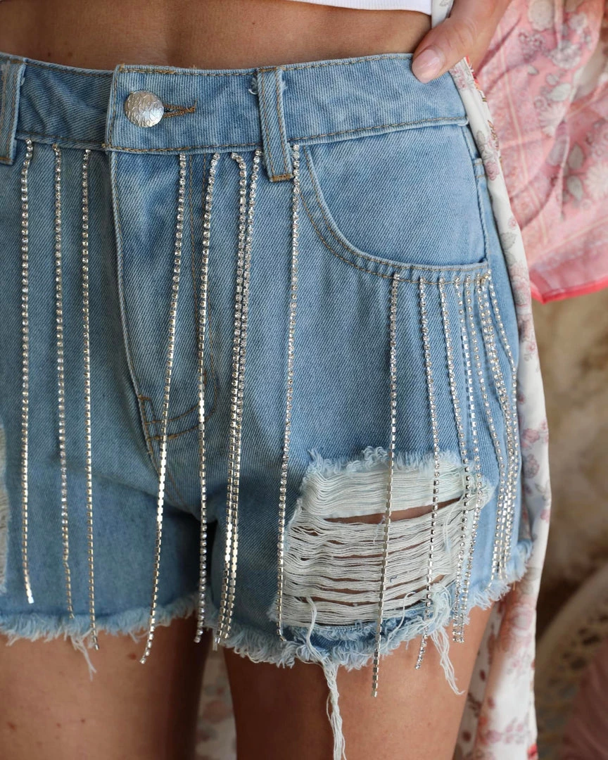 A pair of frayed hem denim shorts featuring high-waisted, stone fringe details, front distressing, belt loops, traditional five-pocket construction, and a mini length.
