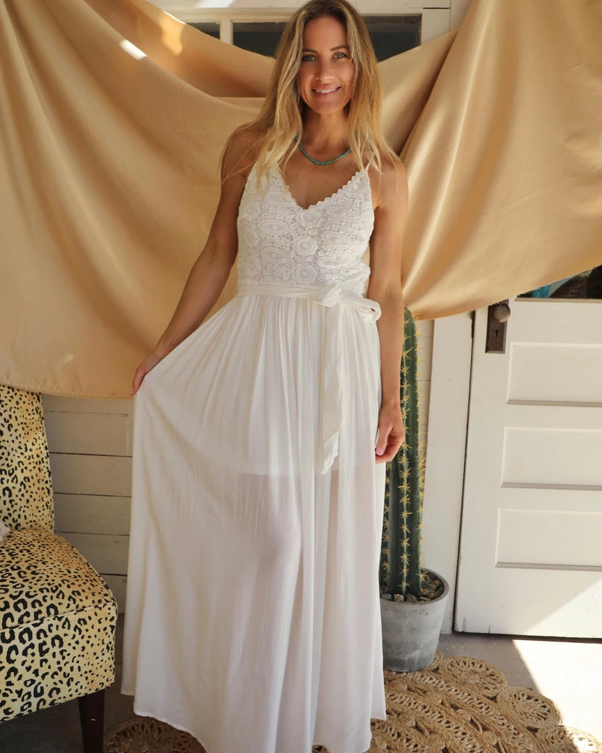 -LACE MAXI DRESS WITH SELF TIE AND ADJUSTABLE STRAPS