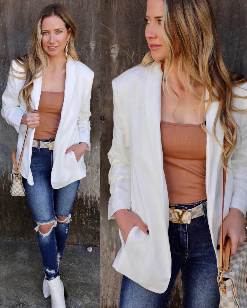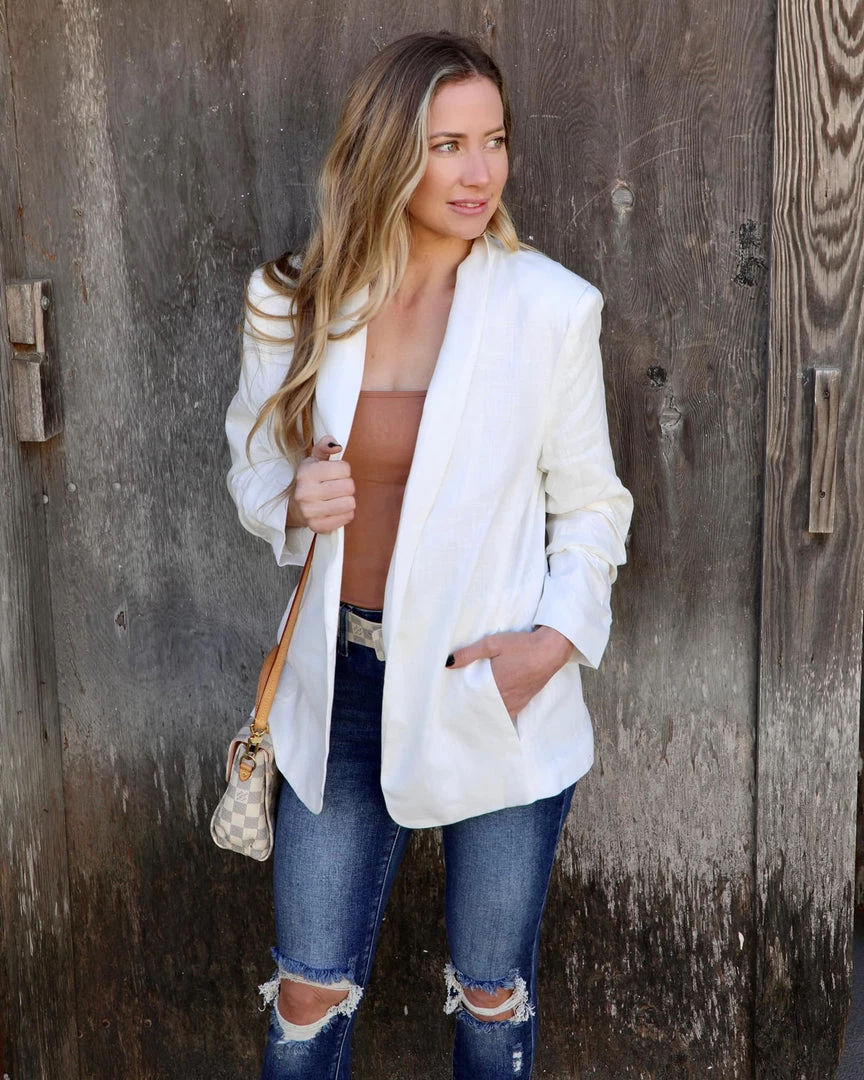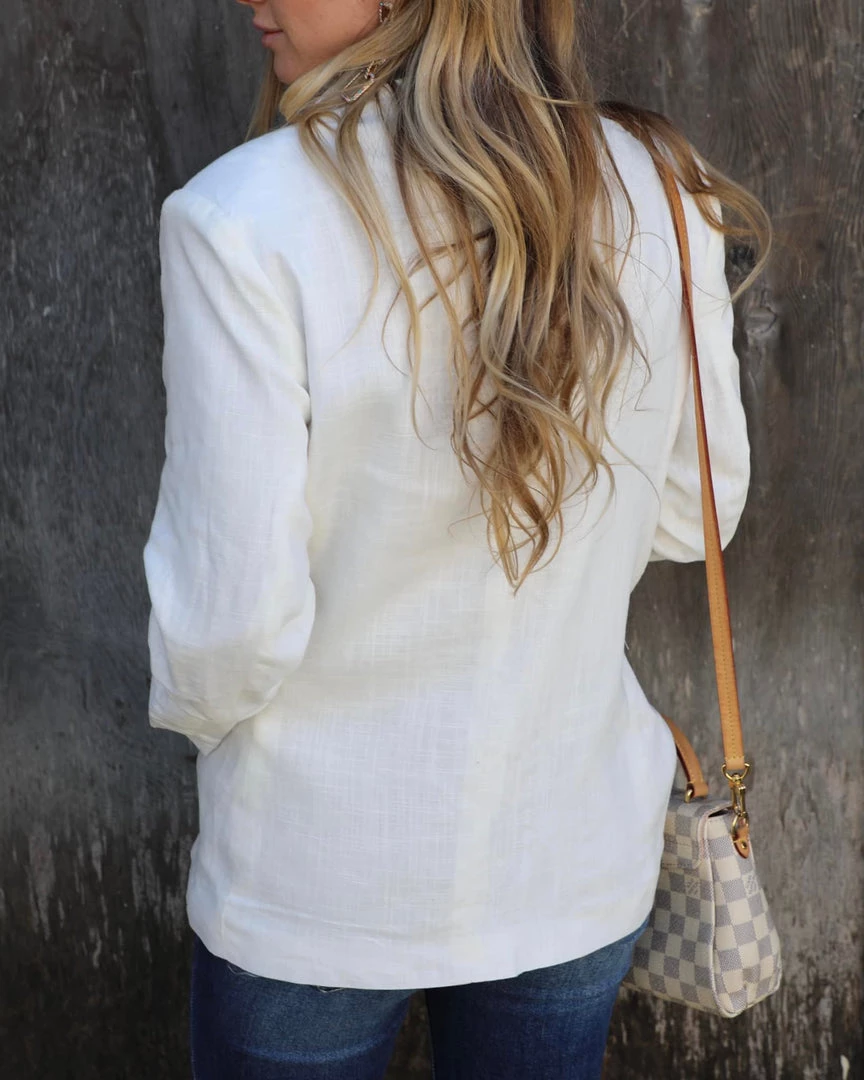 Shawl collar and gathered sleeve flap detail with non-functioning pockets