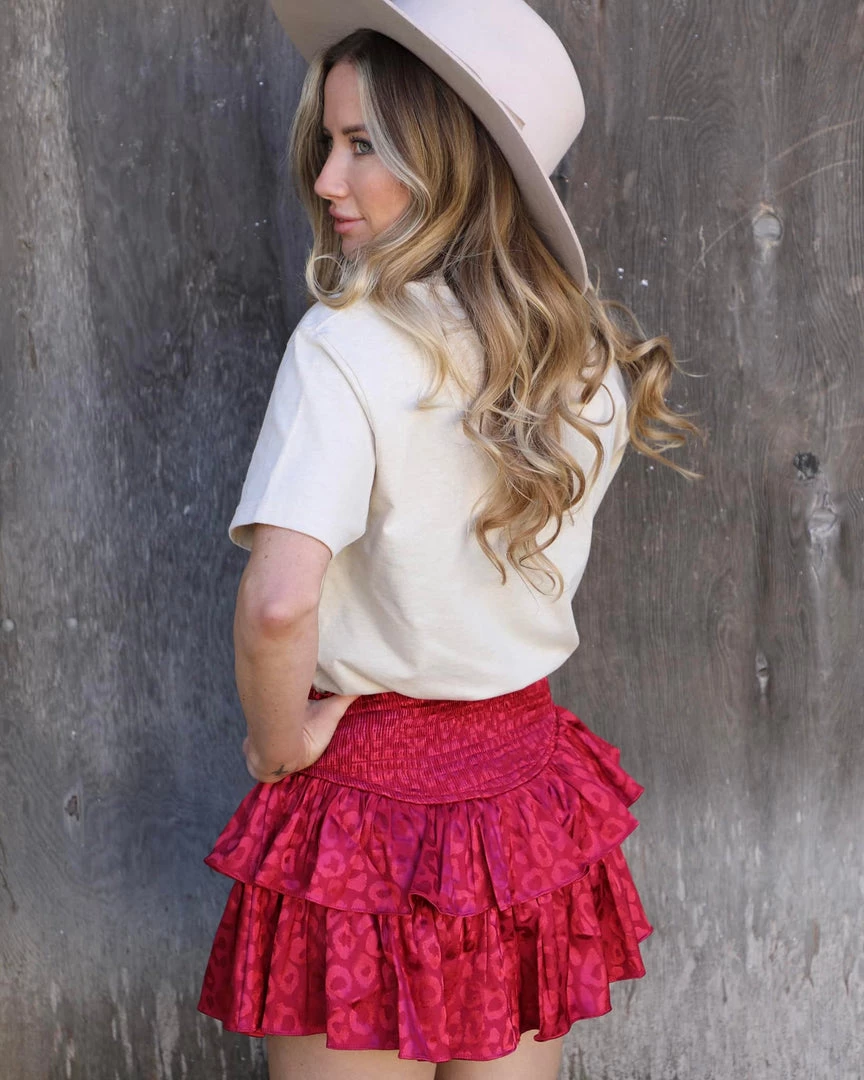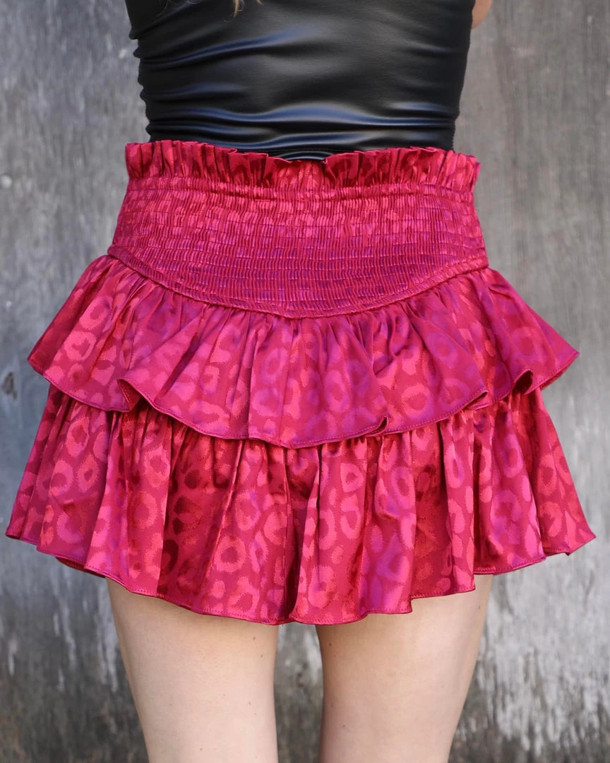 Satin Leopard Ruffled Mini Skirt with stretchy smock waist and ruffle layers