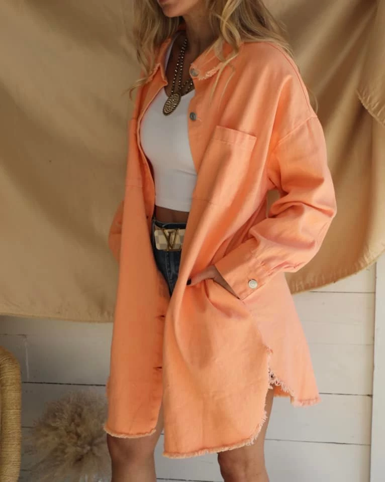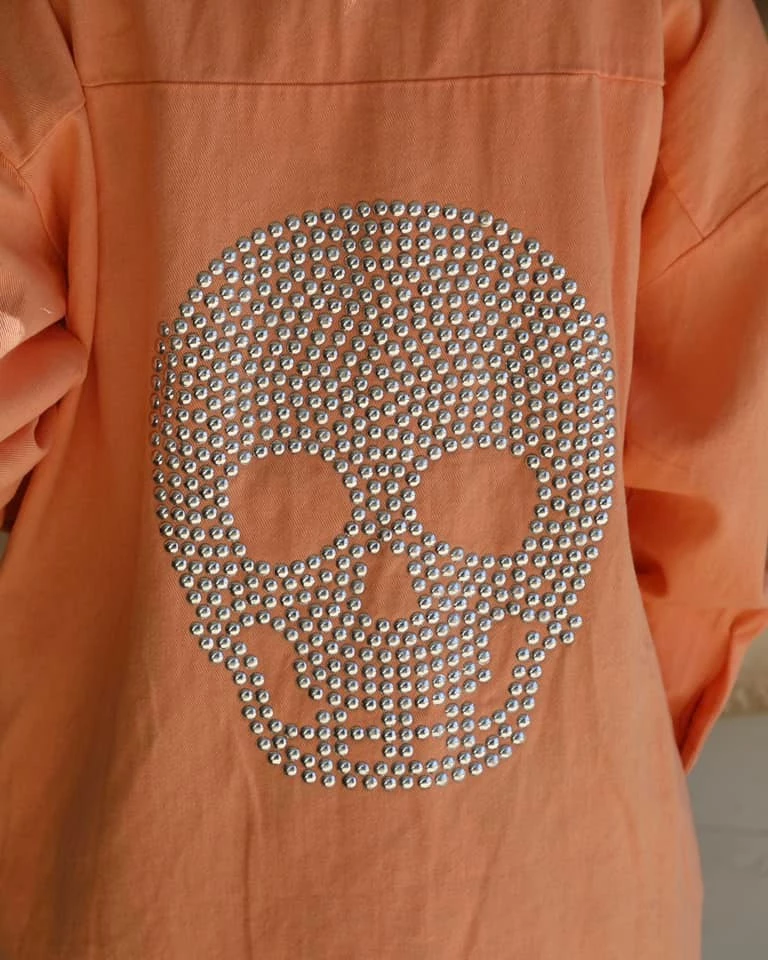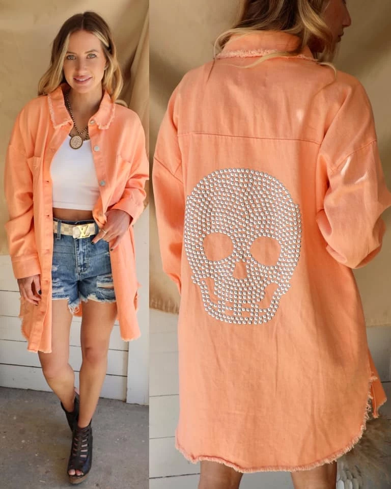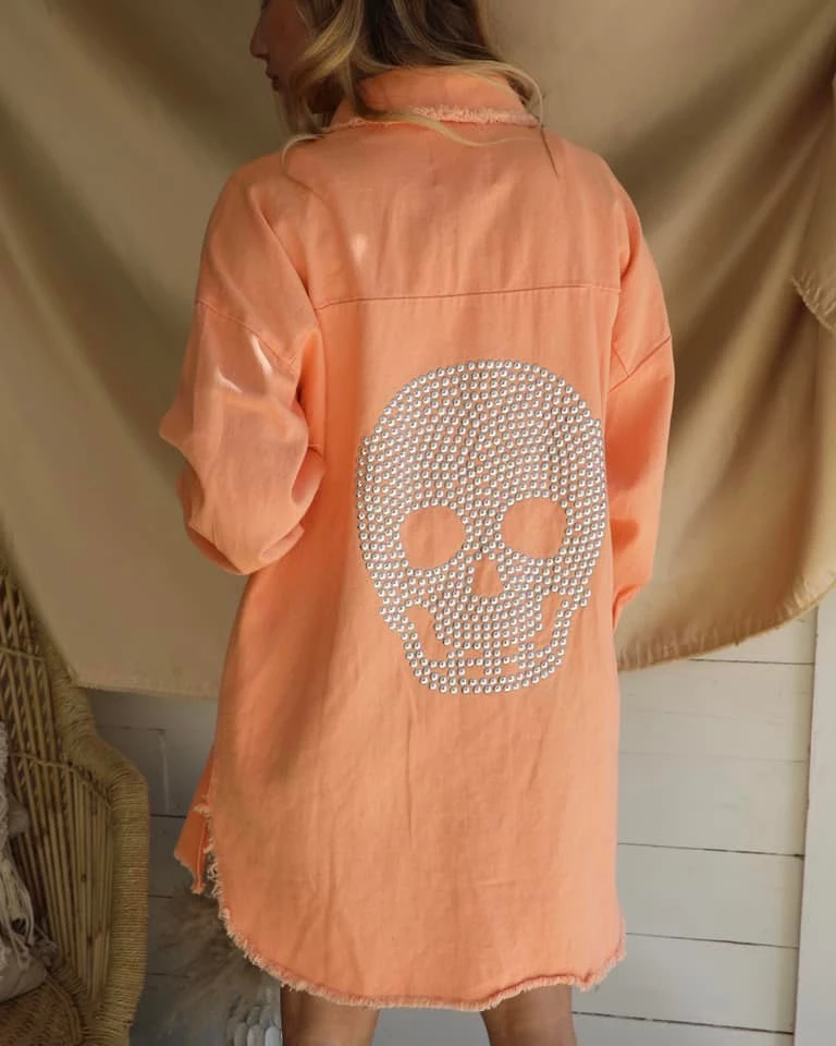 Skull frayed jacket, collared with button down closure, pockets, long sleeve and raw hem.