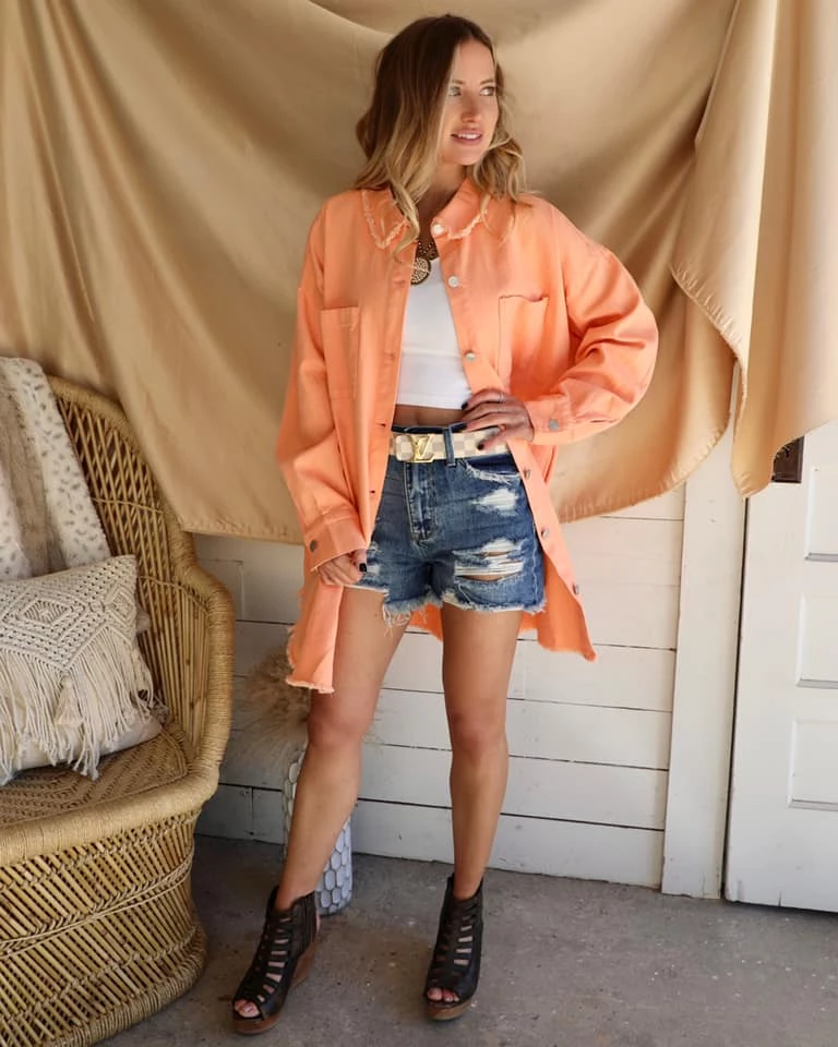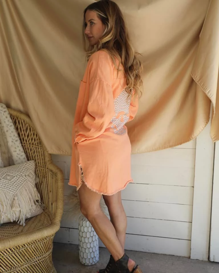 Oversize fit. Haley is size 1 and 5’5” wearing the small