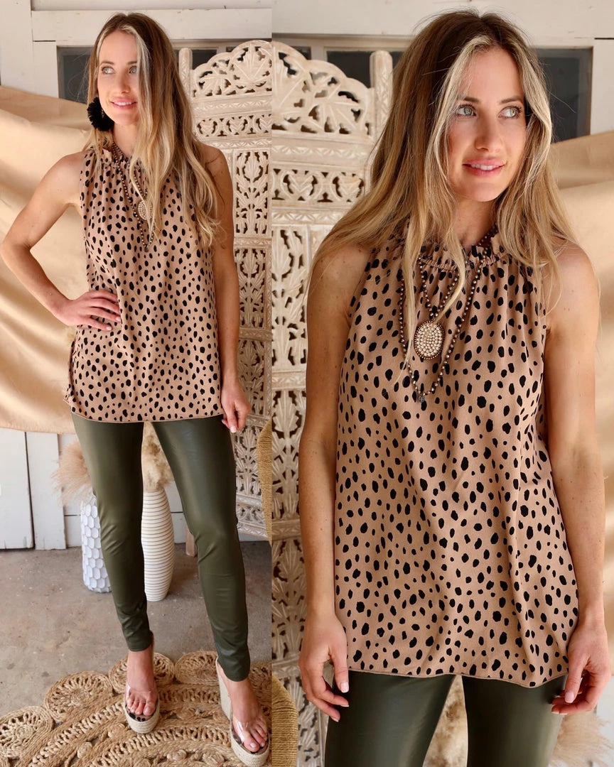 Be the first to review “First Love Apparel Mocha Ditsy Dot Ruffled Mock Neck Blouse” Cancel reply