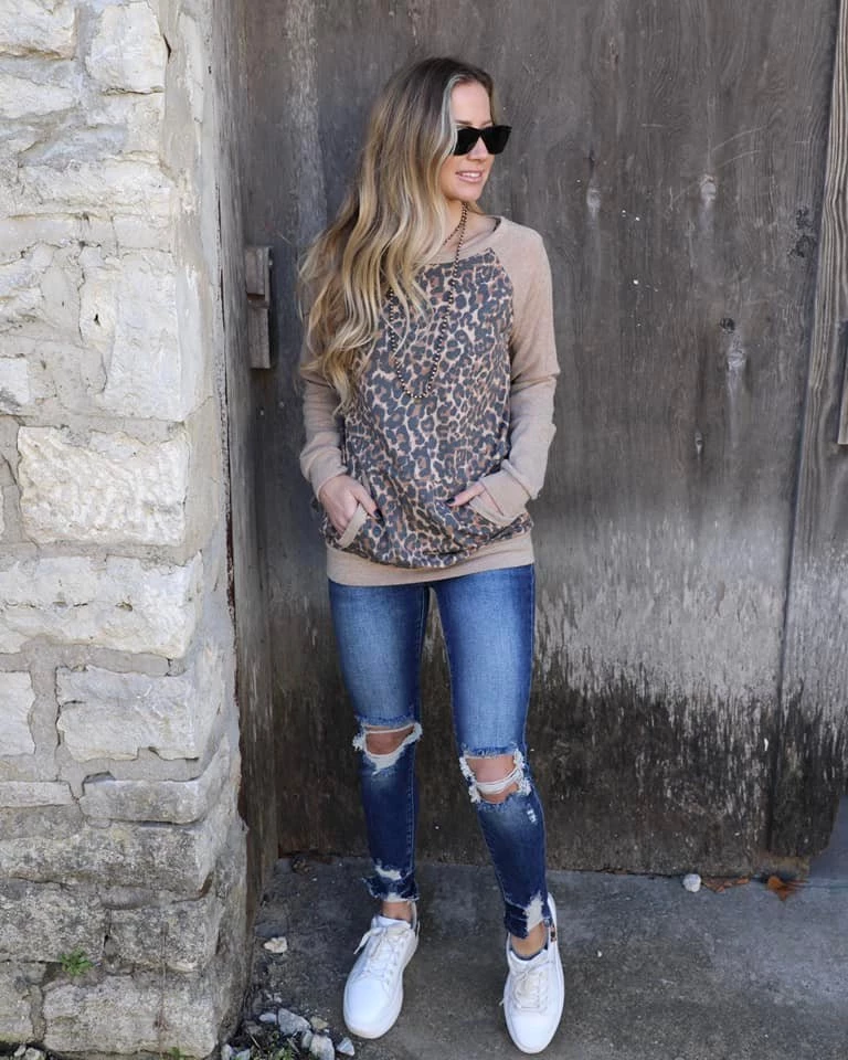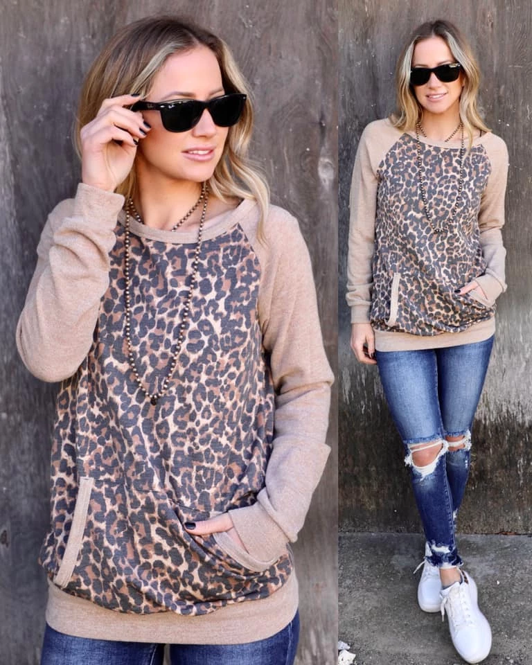 CONTRAST LEOPARD TOP WITH A ROUND NECKLINE, LONG RAGLAN SLEEVES AND A FRONT KANGAROO POCKET