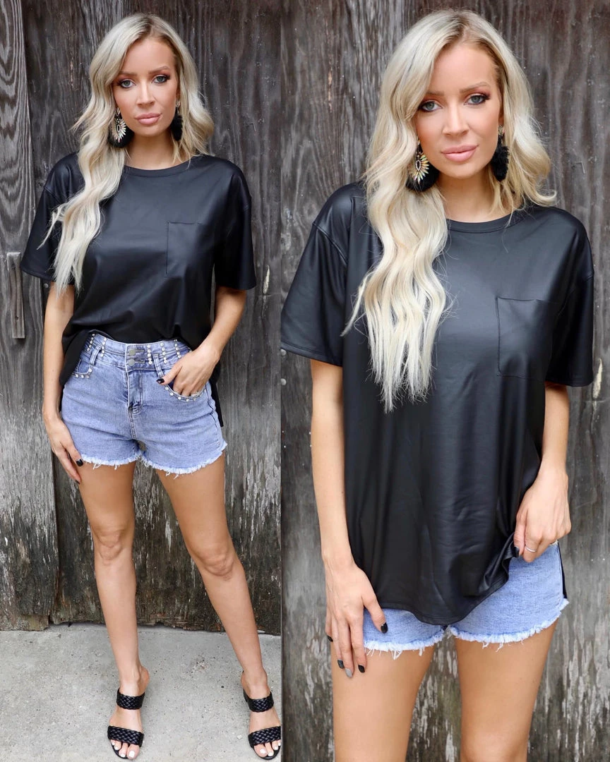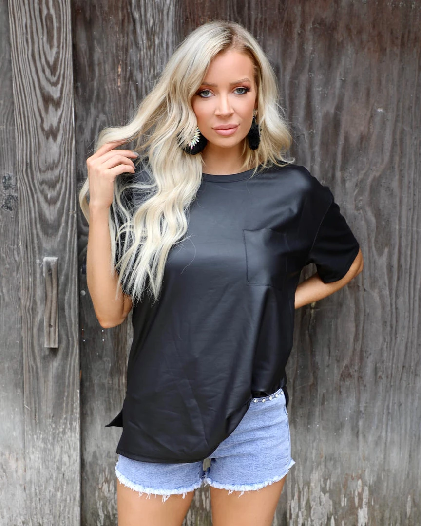 Description: FAUX LEATHER LOOSE FIT TOP WITH POCKET ON THE FRONT AND SHORT SLEEVES. Kelsey is a size 3 wearing the small.