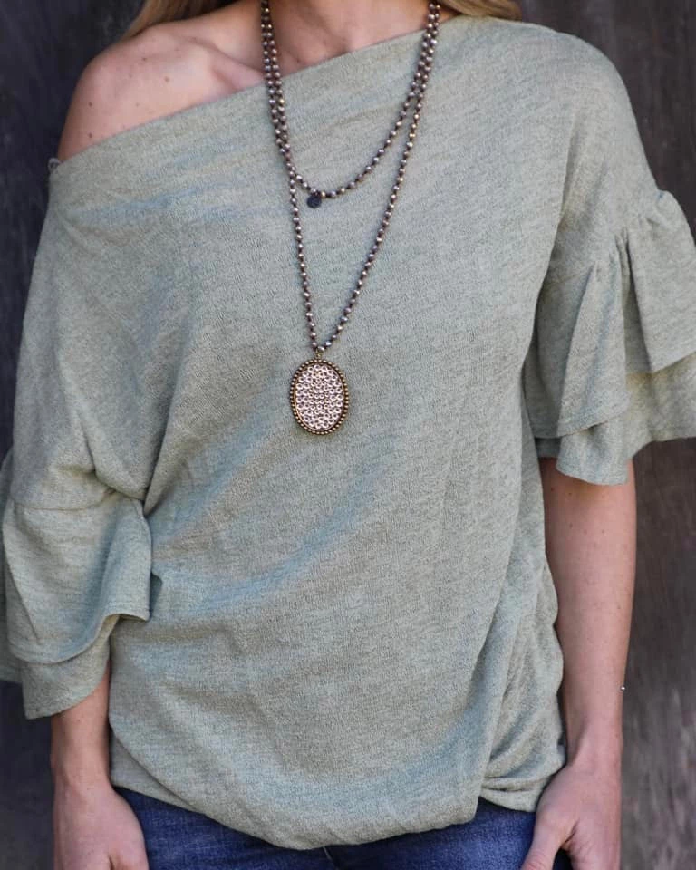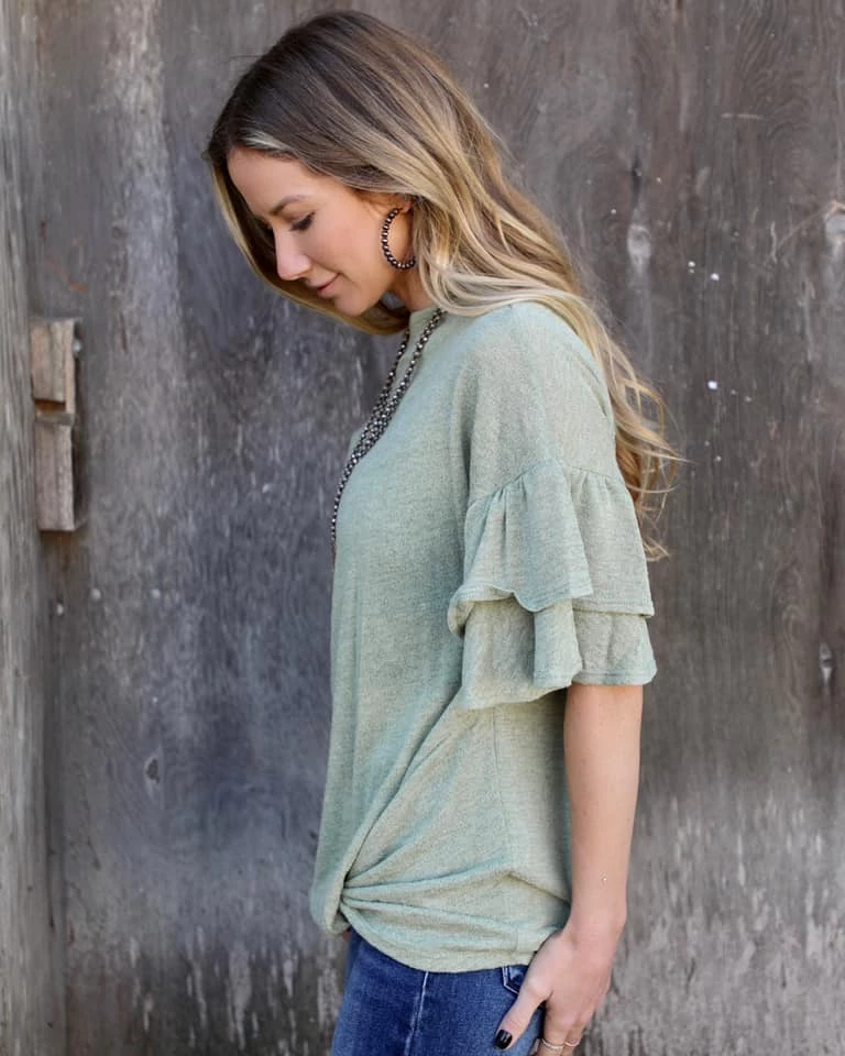 Olive Ruffle sleeve top with boat neck. Can be worn on or off shoulder and twist hem