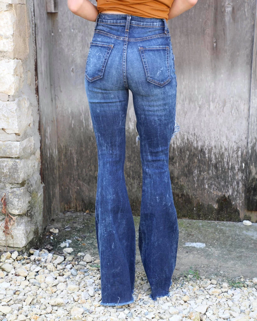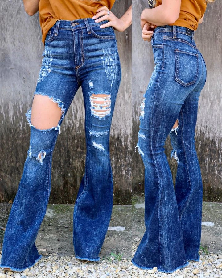 Full Length 5 Pocket Flare Jean features heavy rip detail