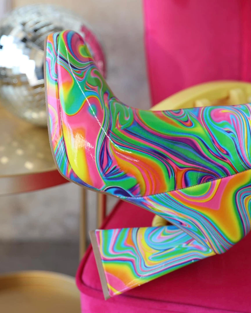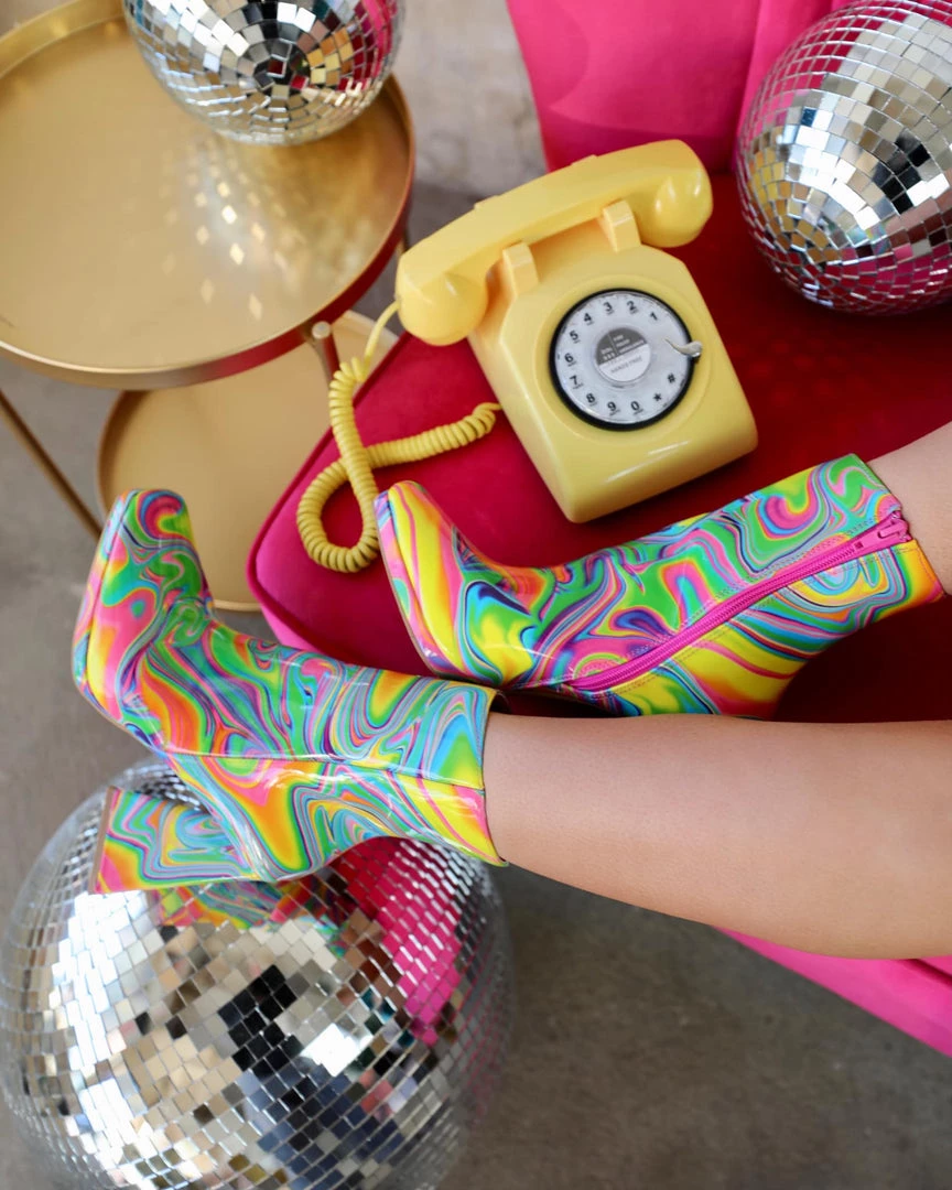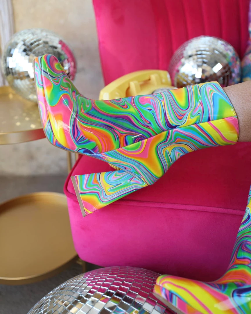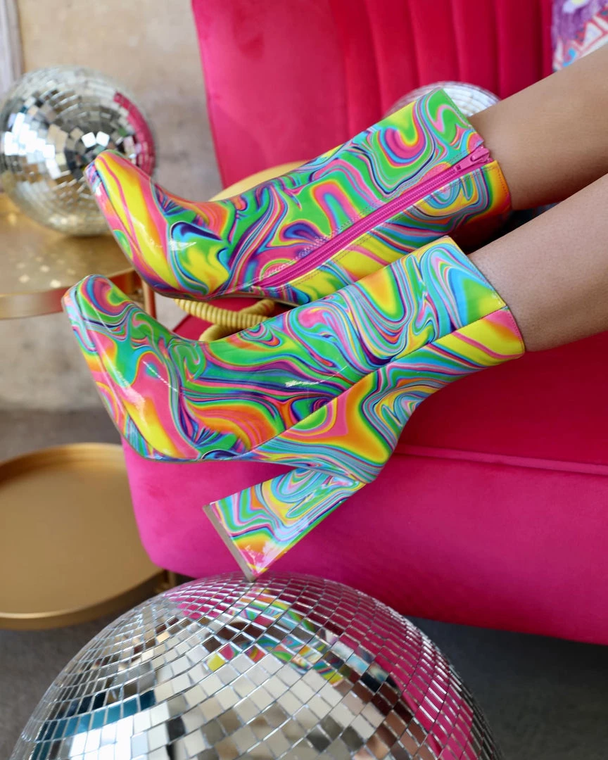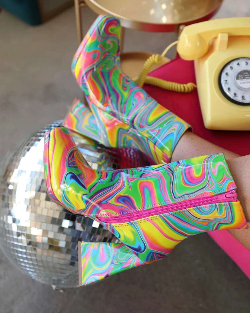 Let’s take it all the way back to the 60’s with these psychedelic square heel boots!