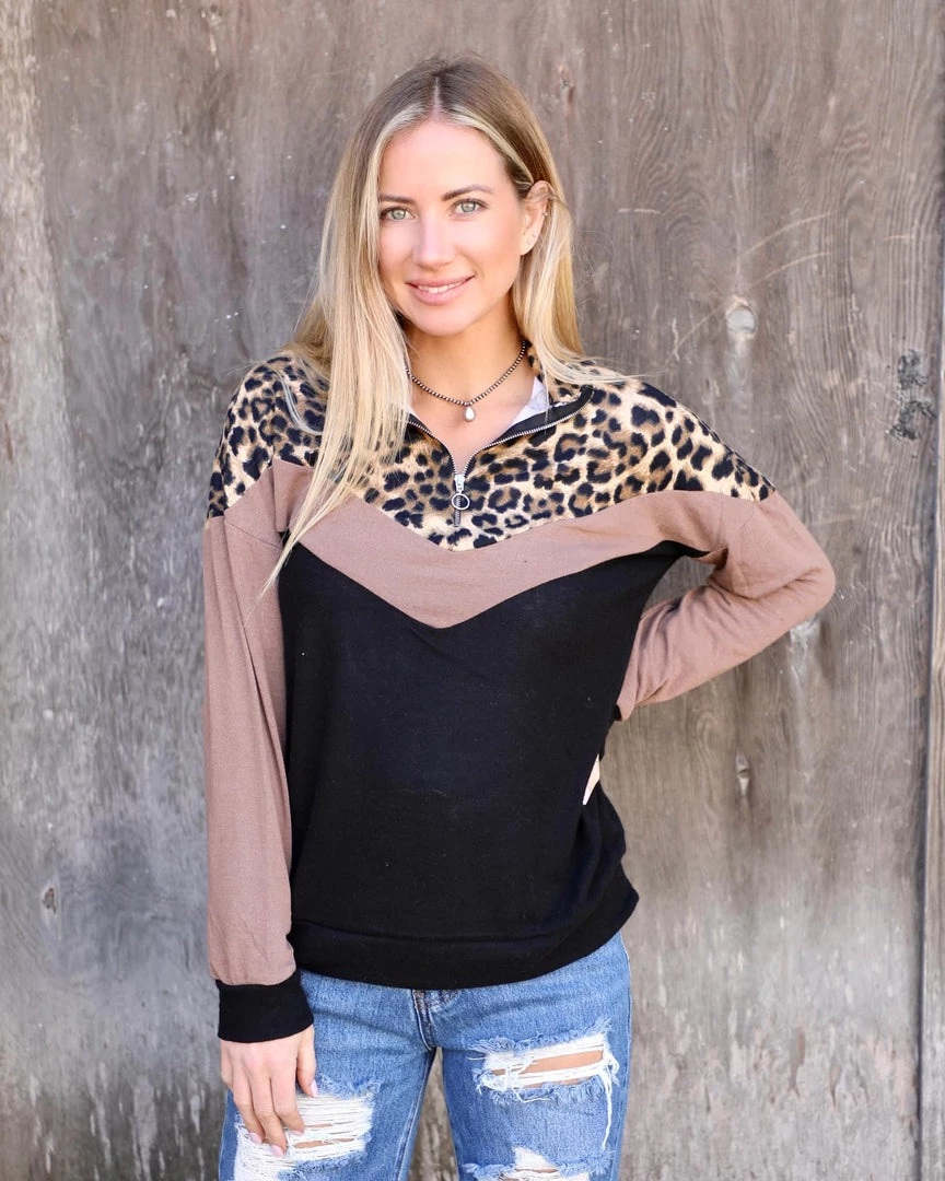 Chevron inspired brushed hacci top with color blocked bodice and sleeve. Animal print creates a wildly chic look when you put on this top.
