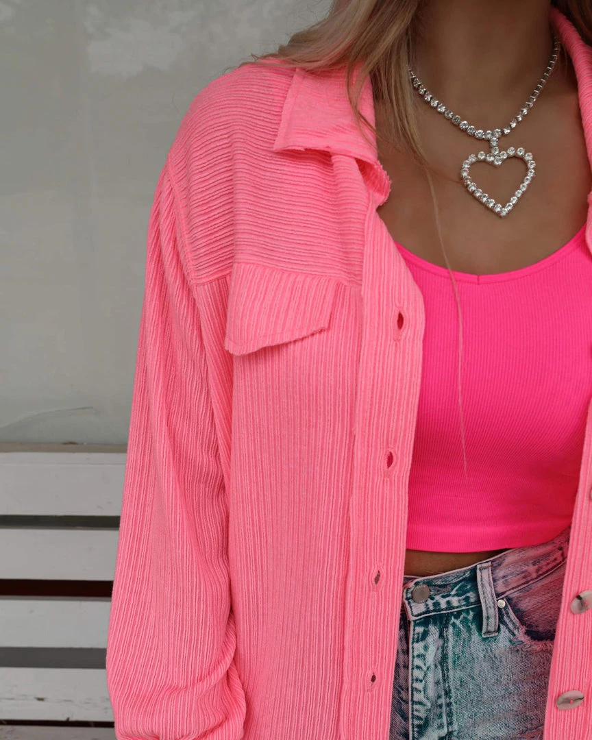 SKU: hailey-co-7224283168945 Categories: Apparel, Kelsey's Faves, Neon Summer, Shackets, TOPS, Tops, Trends Tags: Apparel, Faves, May22, Neon, Outerwear, Pink, Shacket, Top
