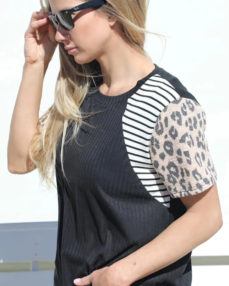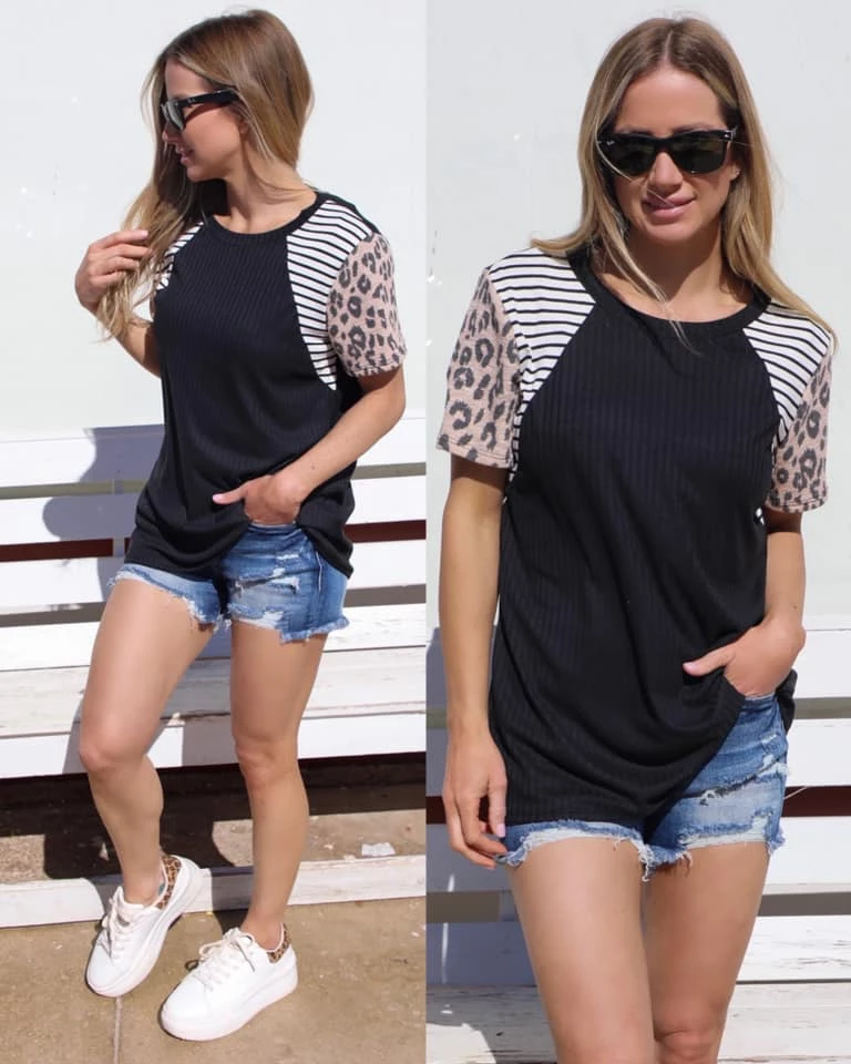 ROUND NECK STRIPE LEOPARD ANIMAL PRINT COLOR BLOCK SHORT SLEEVE KNIT TOP