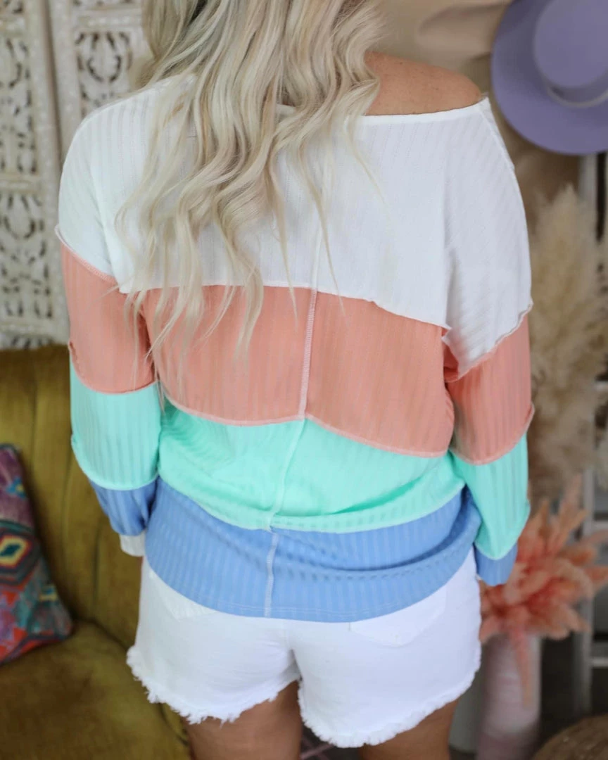 PLUS SIZE V NECK POINTELLE COLOR BLOCK BUBBLE LONG SLEEVE OVERSIZED KNIT TOP WITH OUT SEAM OVERLOCK REVERSE STITCHES