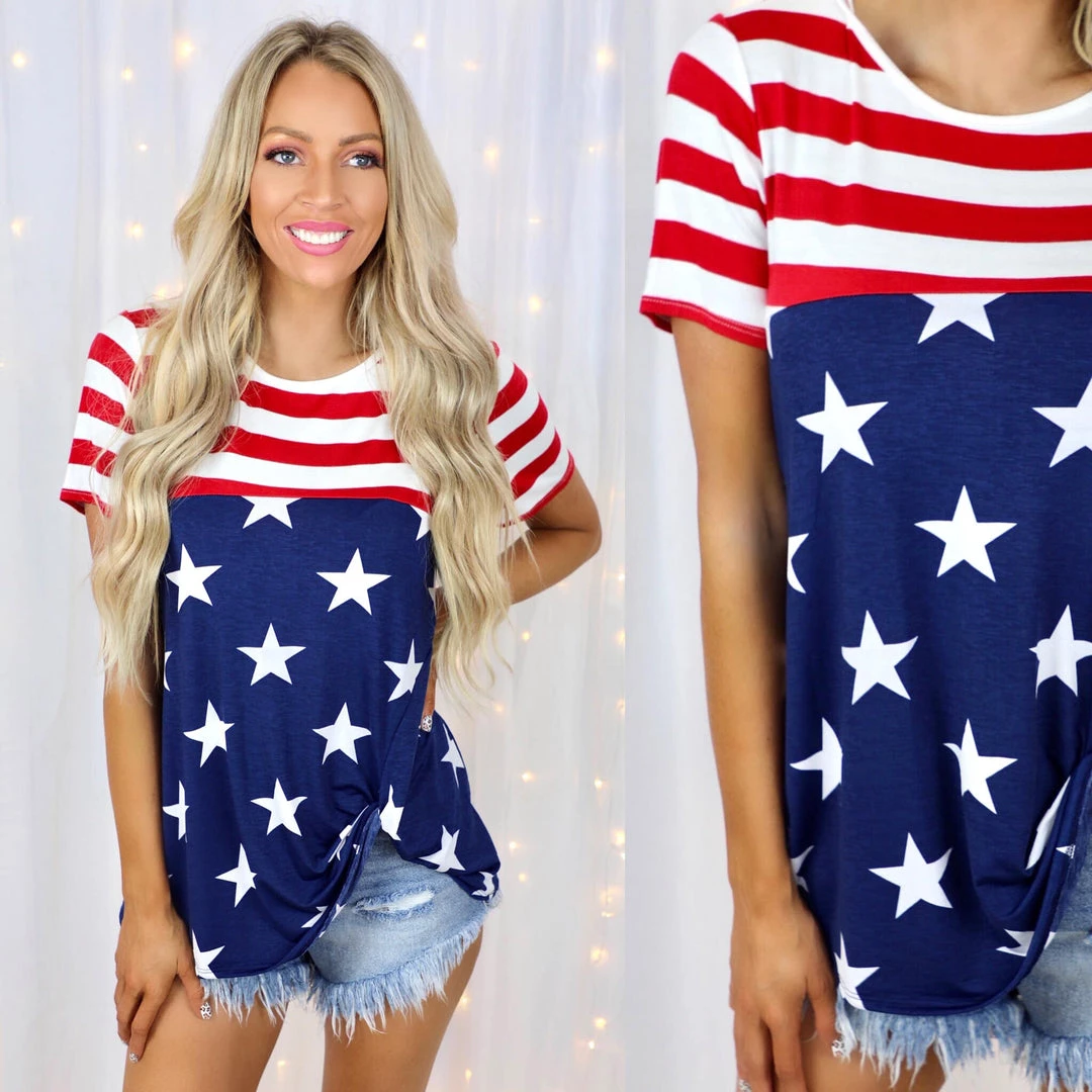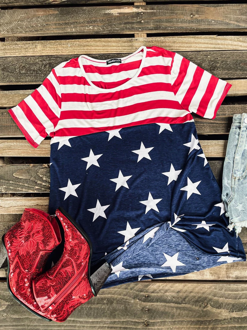 SKU: heimish-7215061991601 Categories: Americana, Apparel, TOPS, Tops, Trends Tags: Apparel, Apr22, Blue, Red, Shirt, Stars, Stripes, Top