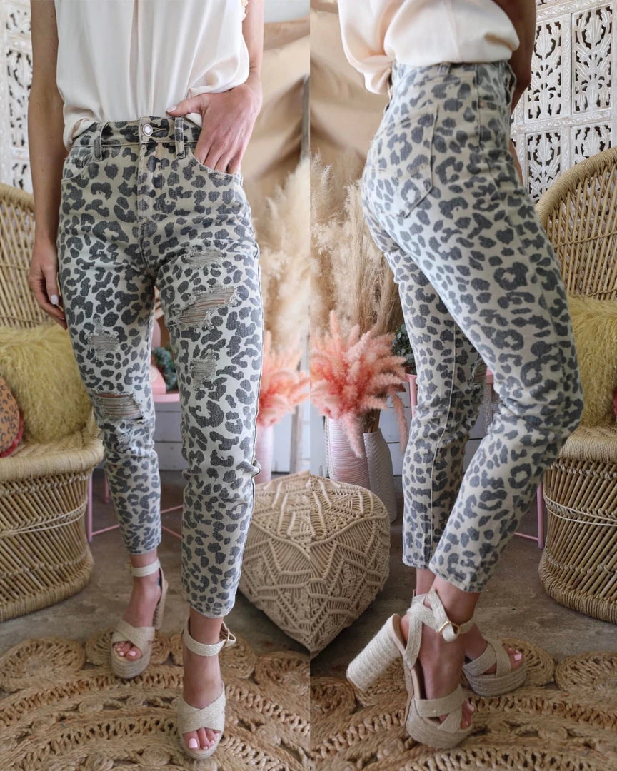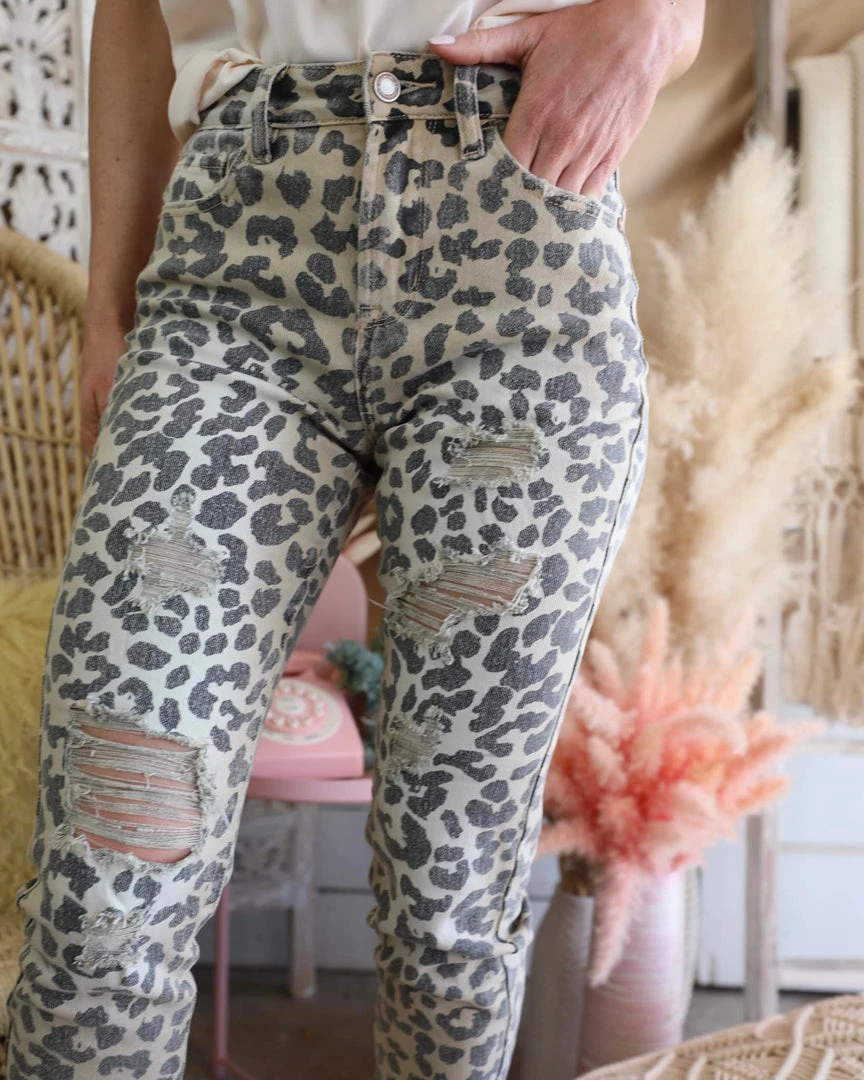 High Rise Distressed Leopard Skinny Jeans