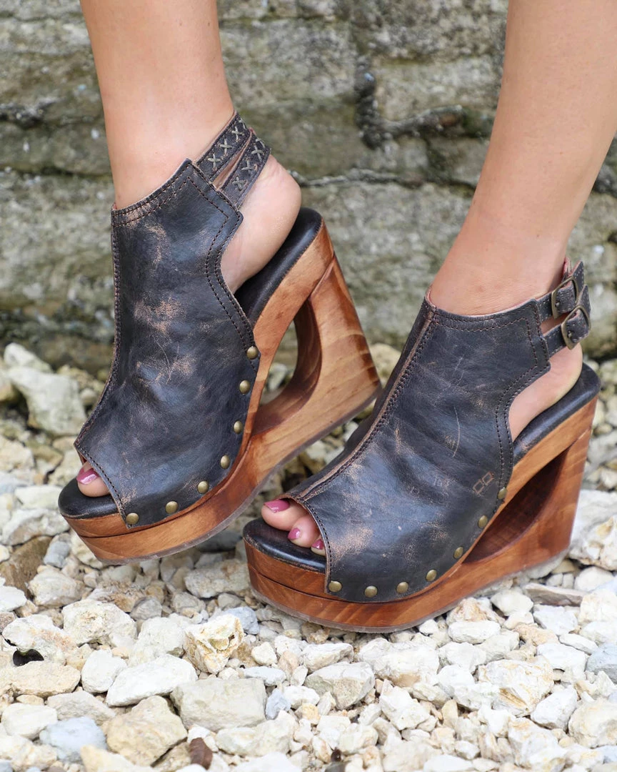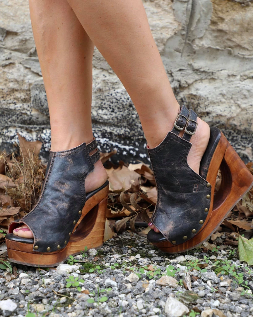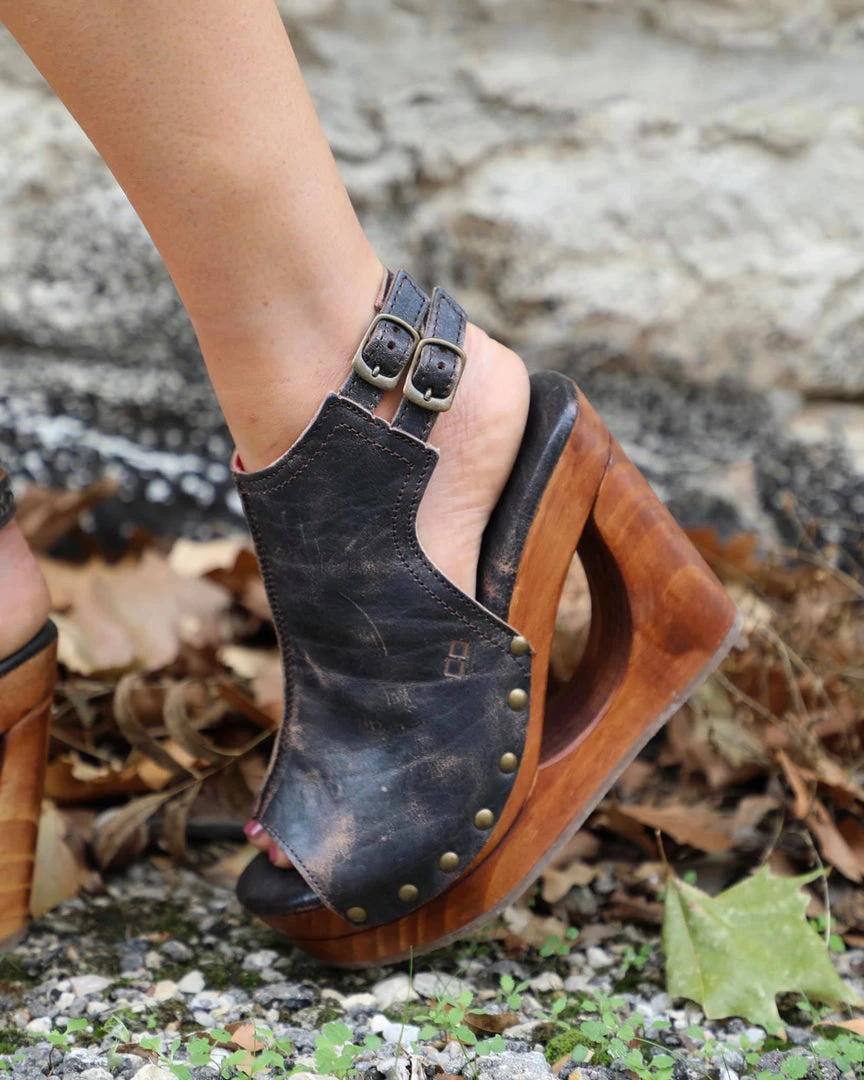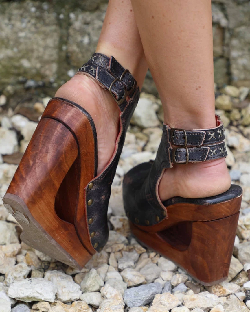 Drown in vivid hues with IMELDA strapped on. This veg tanned leather wedge boasts so much character you will wonder where she has been all your life! IMELDA has a peep toe, towering wooden wedge heel with an imaginative cut-out, metal studs and two ankle buckles. Experience height, style, and thrilling nights ahead in IMELDA.