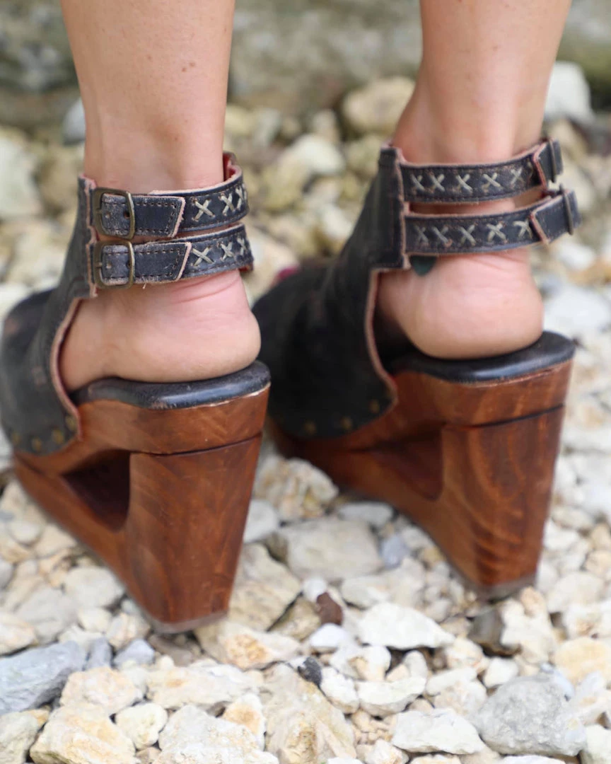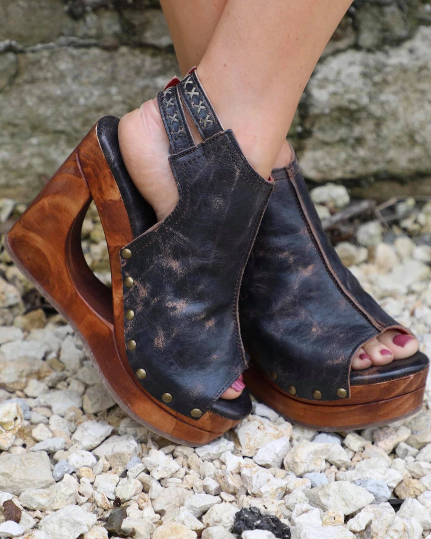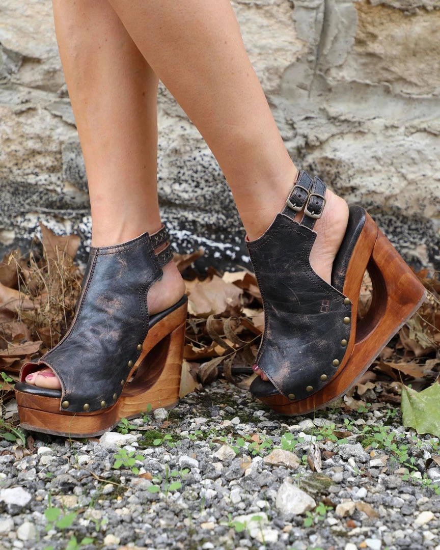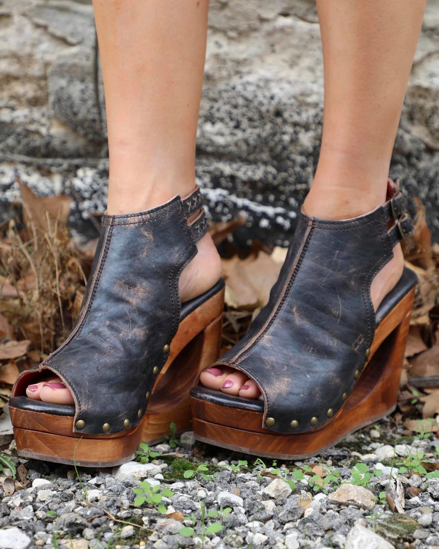 Drown in vivid hues with IMELDA strapped on. This veg tanned leather wedge boasts so much character you will wonder where she has been all your life! IMELDA has a peep toe, towering wooden wedge heel with an imaginative cut-out, metal studs and two ankle buckles. Experience height, style, and thrilling nights ahead in IMELDA.