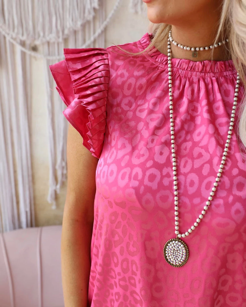 Flowy relaxed satin leopard print dress with a frill mock neckline, pleated cap sleeves, side pockets, and a ruffle hemline. – Unlined, non-sheer, lightweight.
