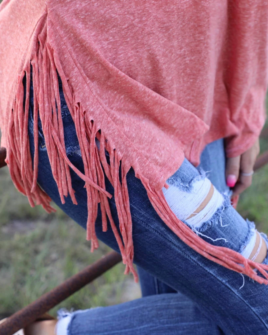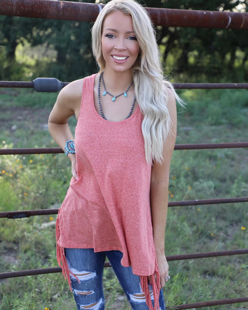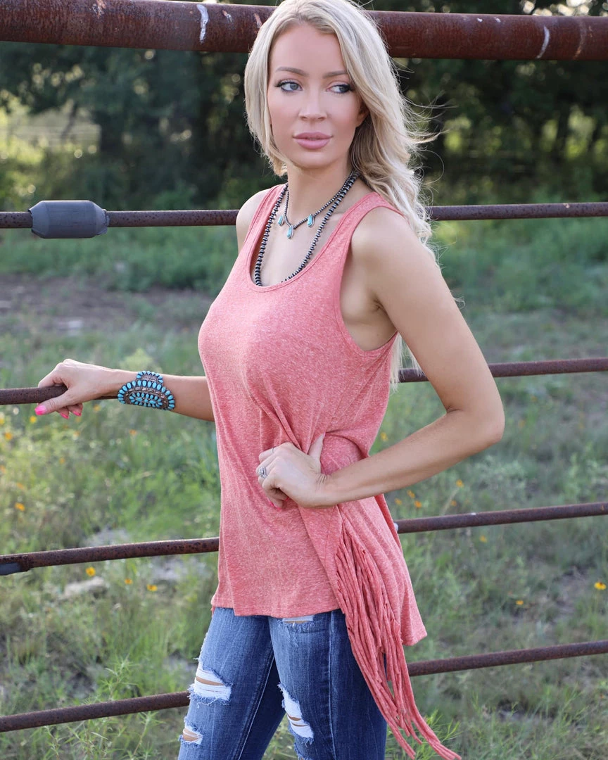Heathered Brick casual tank top with round neckline and sides self fringe