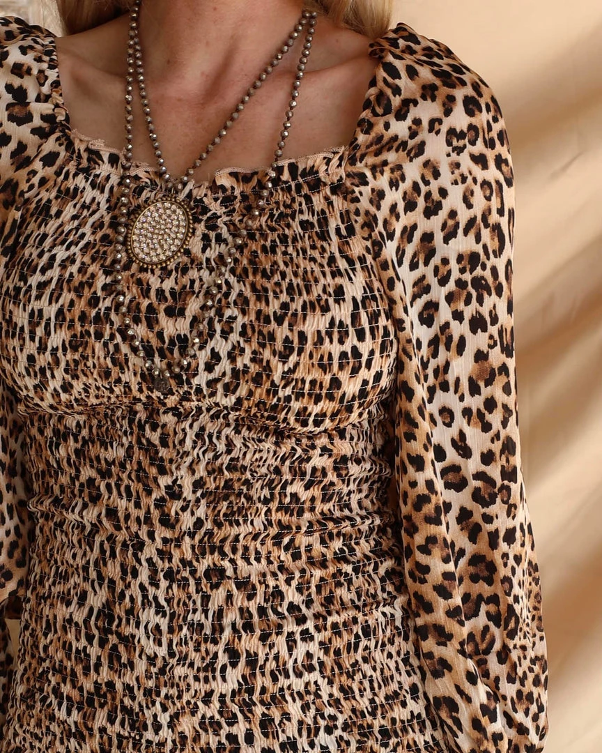 Leopard mini dress with smocked body. l.
