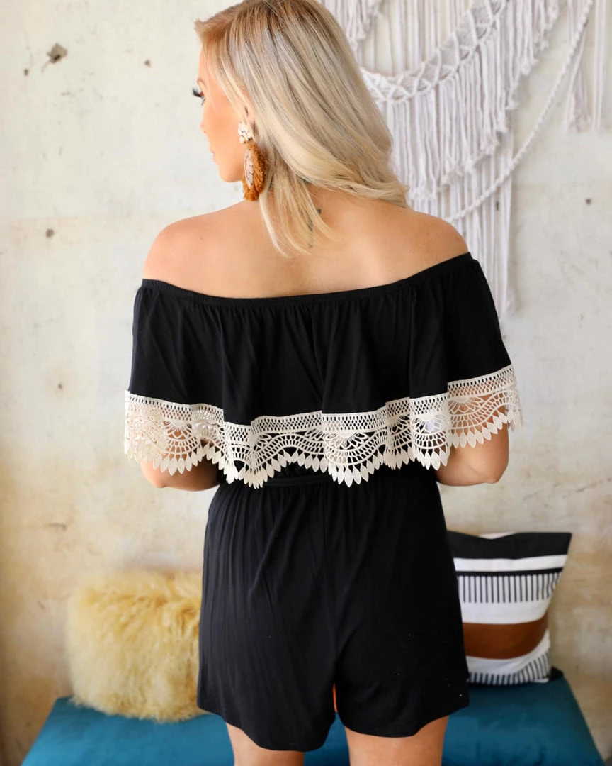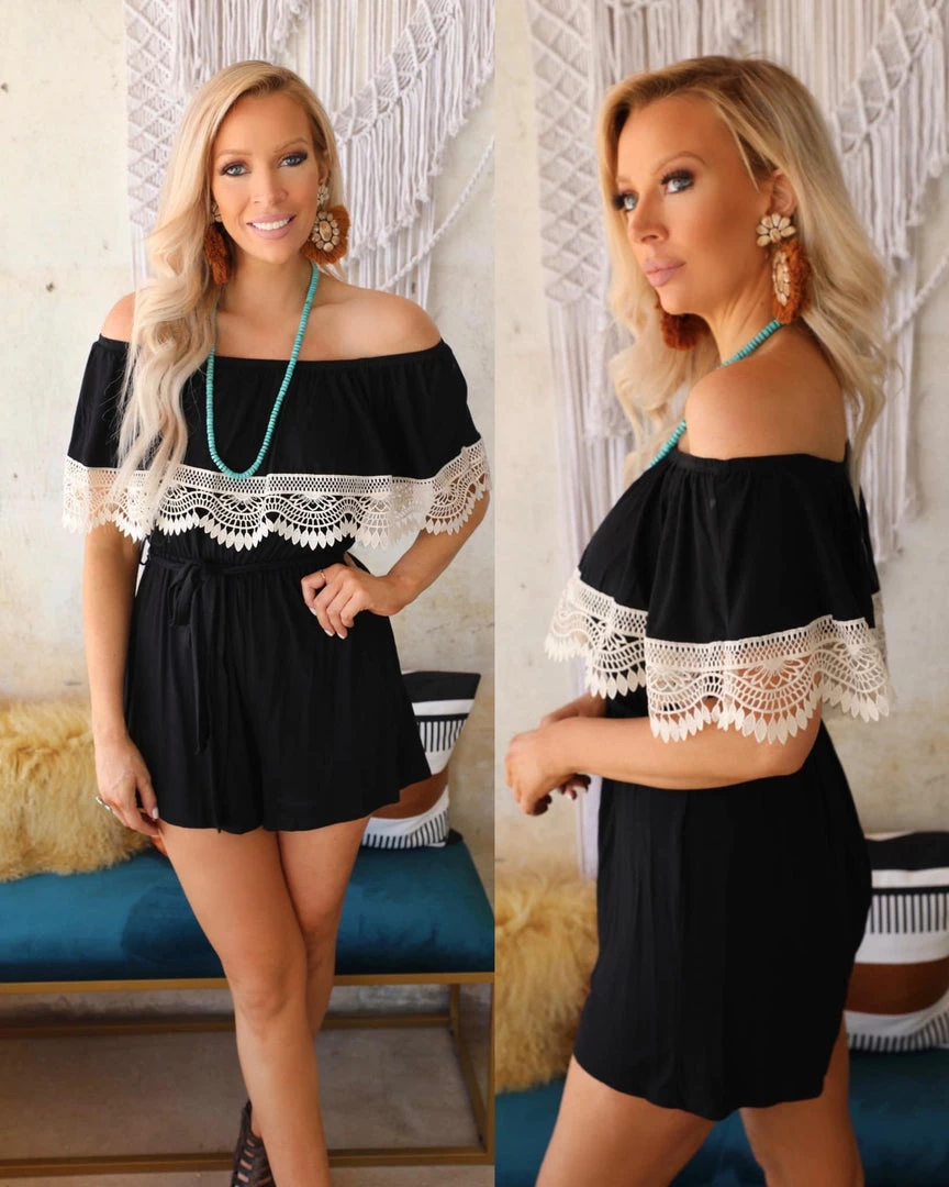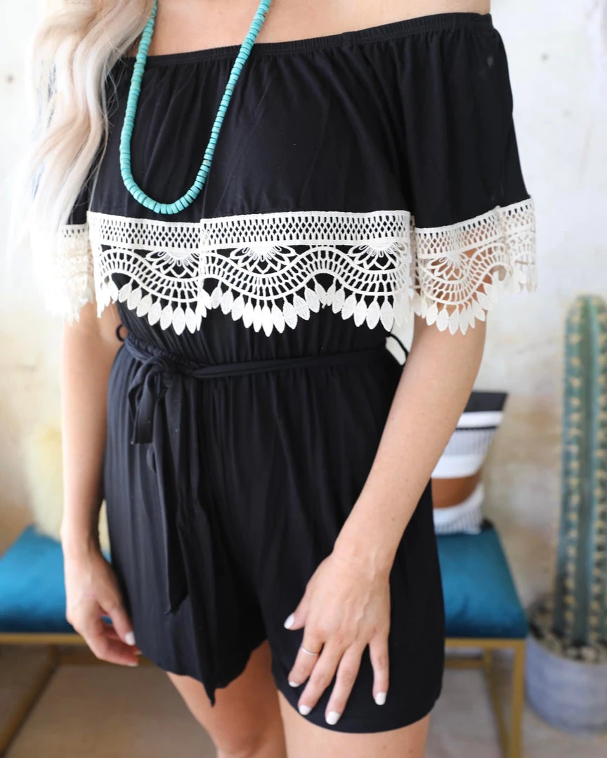 Solid heavy rayon jersey off the shoulder romper with lace trimming details Self sash and elastic waist