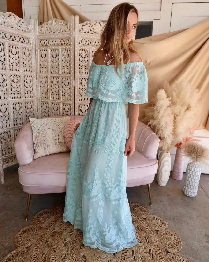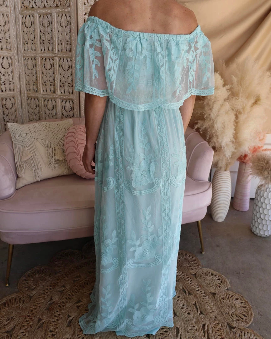 Blue Surf Lace Off Shoulder Maxi Dress