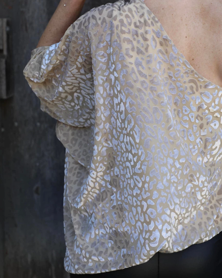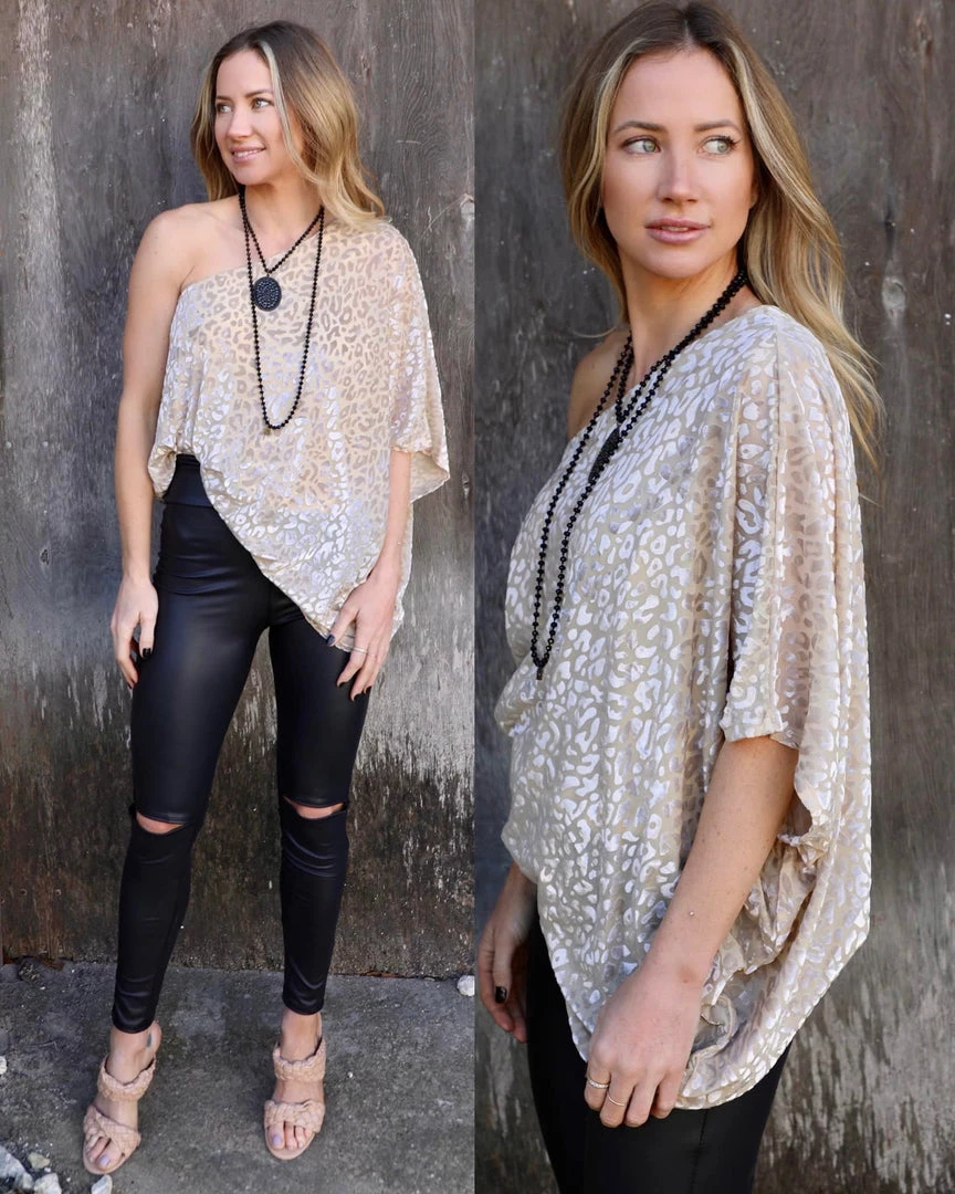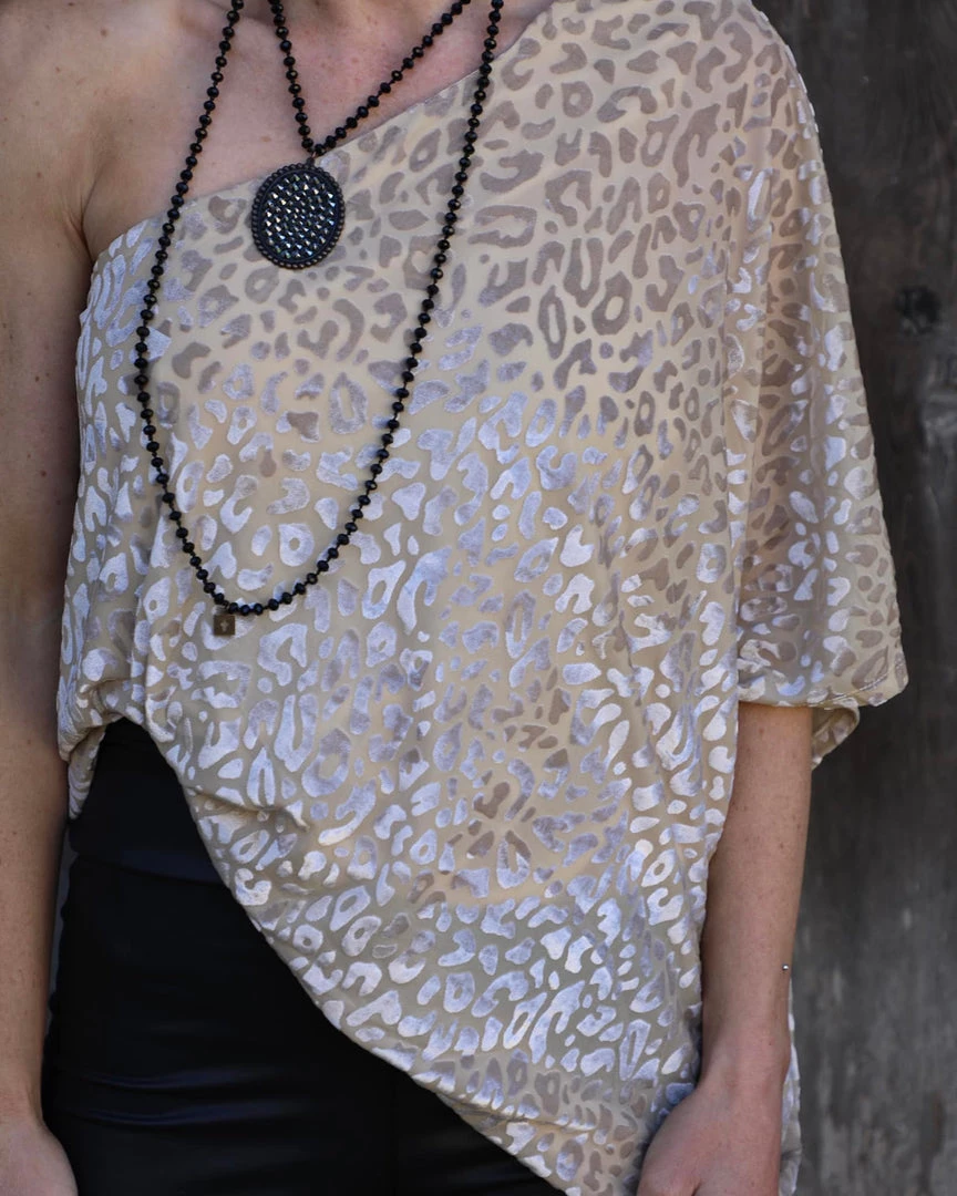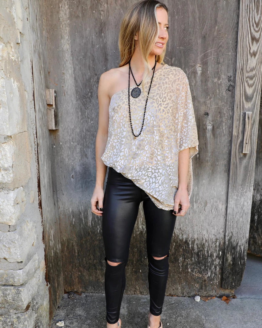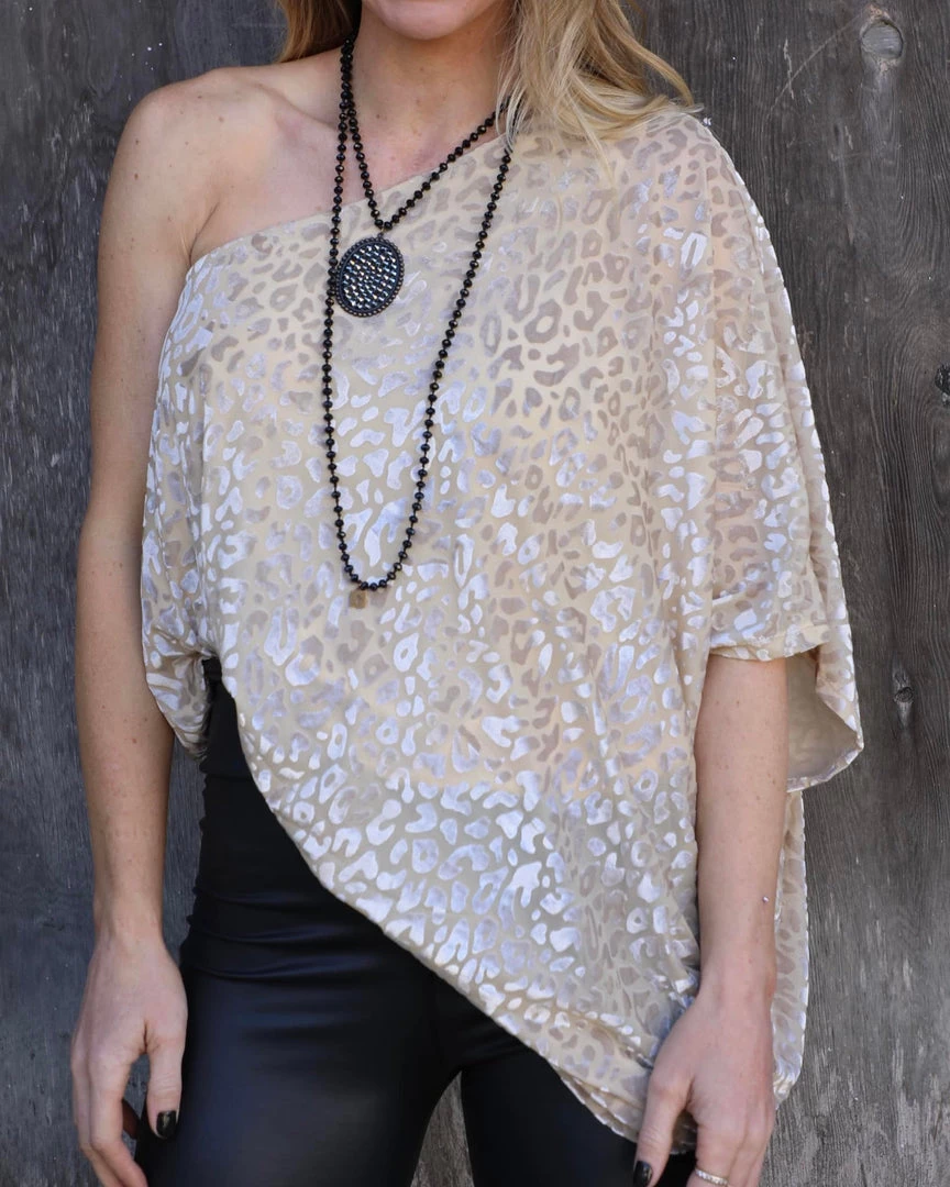 One Shoulder Long Sleeve Unbalance Flocked Leopard Knit Top