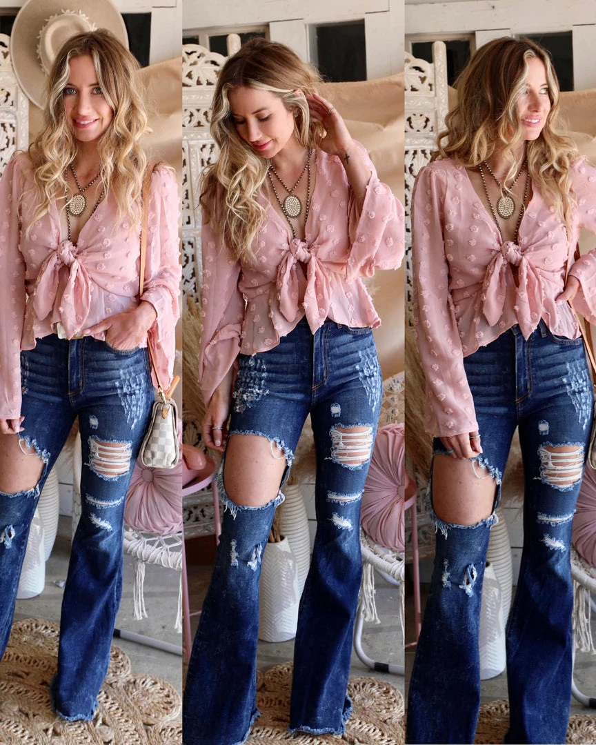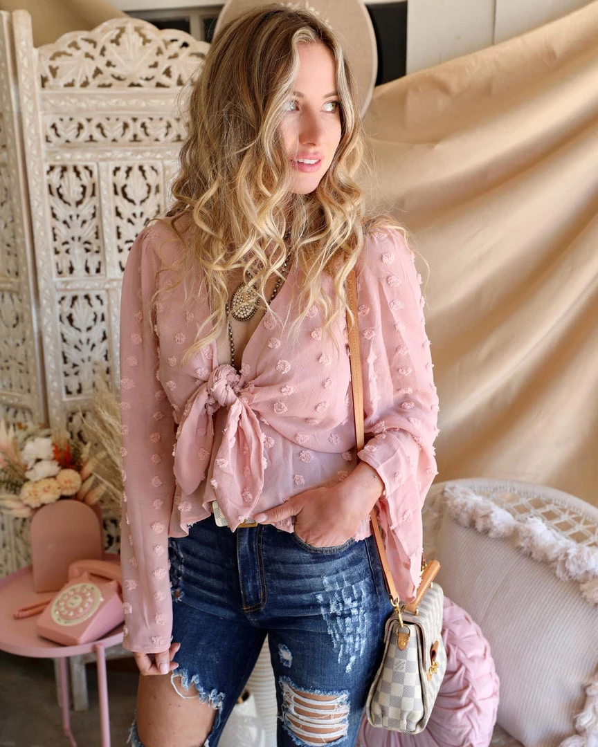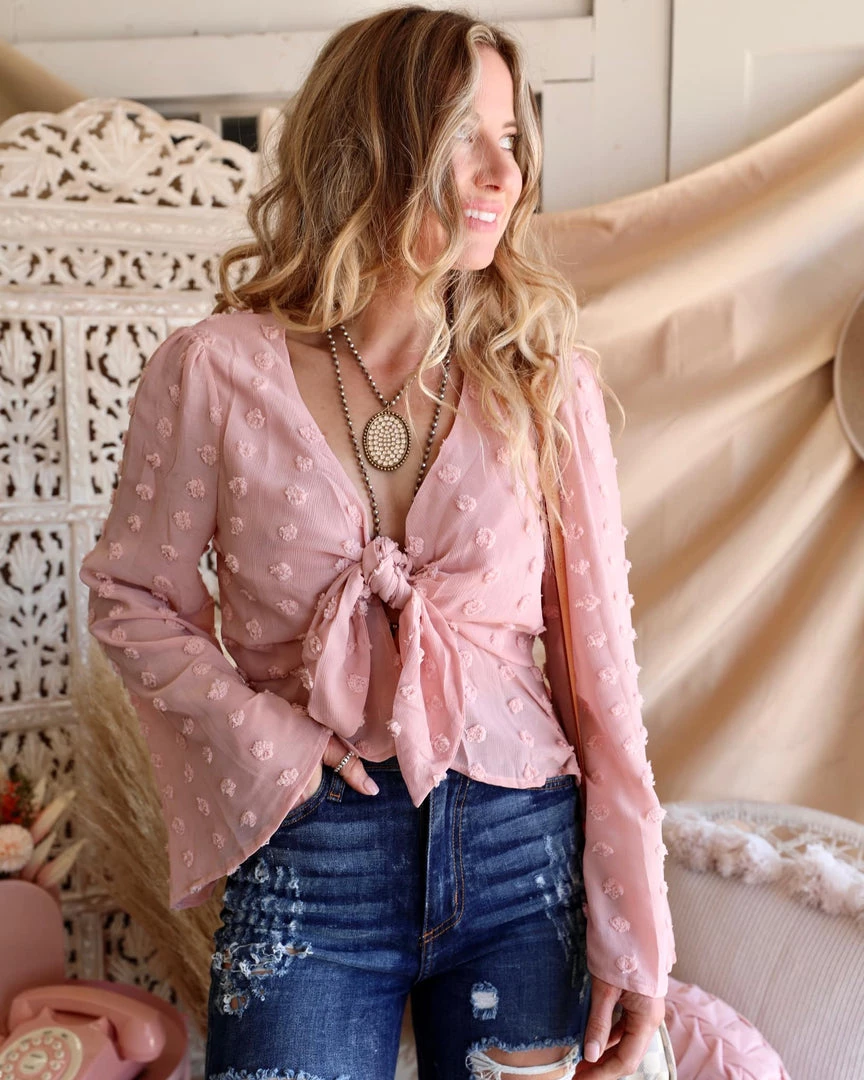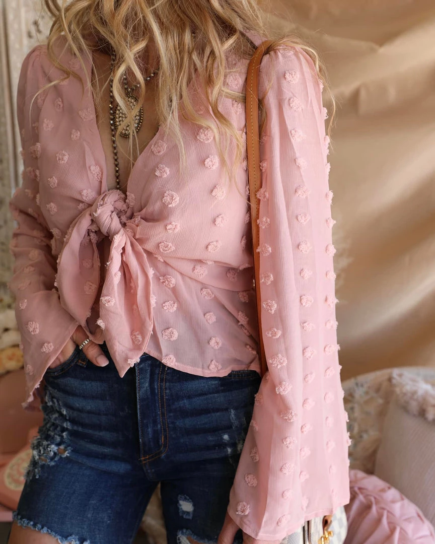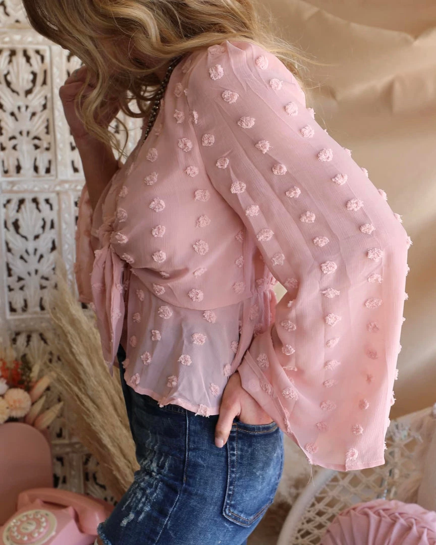 Back Waist Elastic Front Tie Bell Sleeve Peplum Swiss Dot Blouse Top