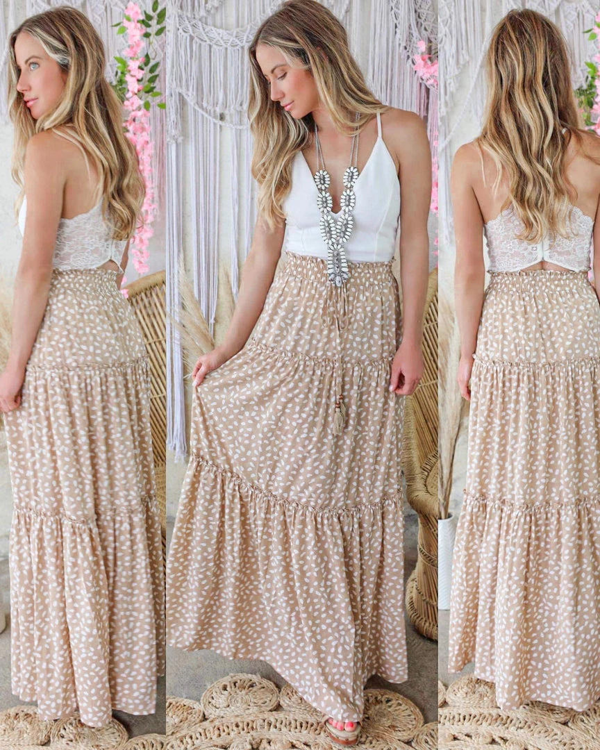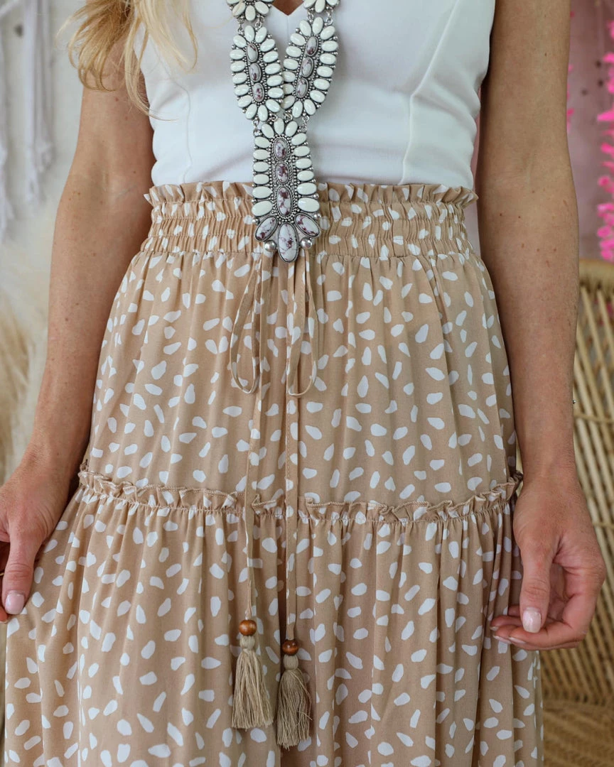 SKU: main-strip-7225032540337 Categories: Apparel, Boho Babe, BOTTOMS, DRESSES, Maxi, Skirts + Skorts, Trends Tags: Apparel, Boho, Maxi skirt, May22, Polka dot, Skirt, Tan, Taupe