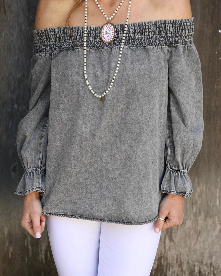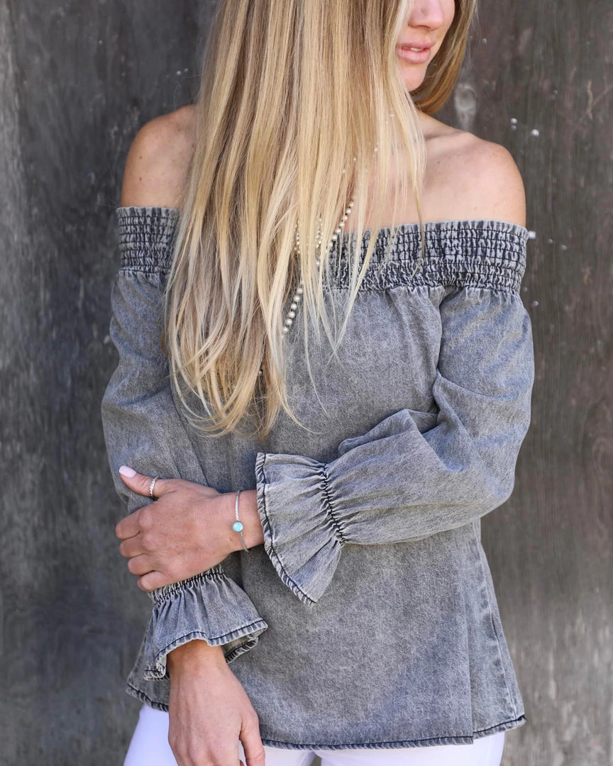 Gray Off shoulder smocking detail washed out ruffle sleeve tie-back denim top