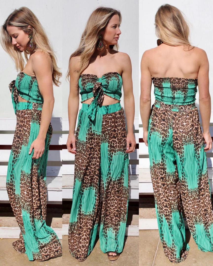 LEOPARD MULTI PRINTED CHIFFON SMOCKING TUBE TOP W/FULL LINING PALAZZO PANT SET CHIFFON