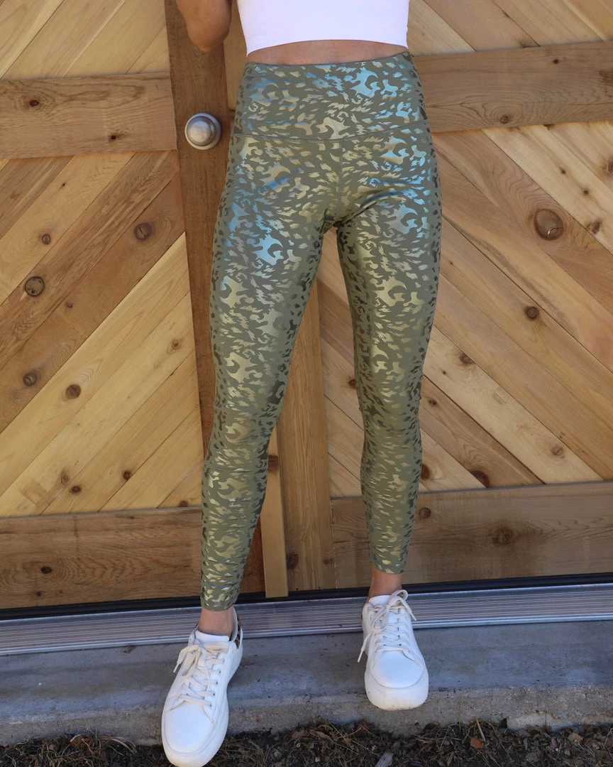 Add some metallic sheen to your animal print collection. Featuring unique foil pattern on a peach backing, these highwaist leggings are flashy and fierce.