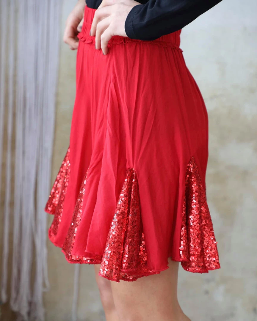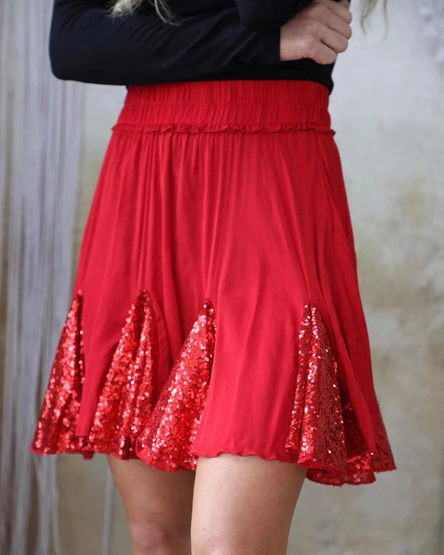 Red stain sequin detail full mini skirt with elastic waist band