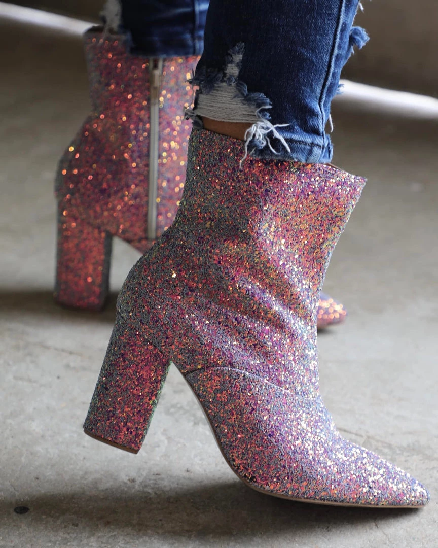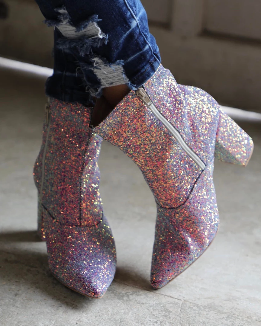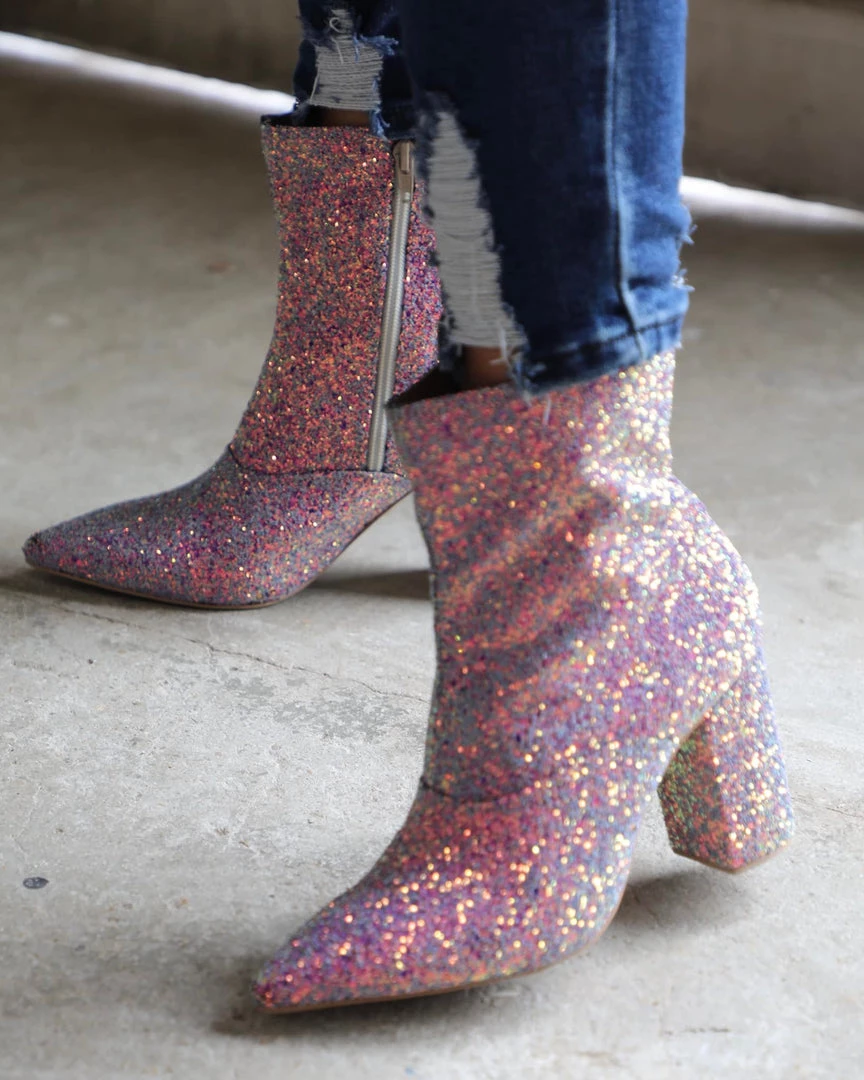 “Old Cutler” ankle glitter booties with pointed toe, leather insole, and sturdy block heel.
